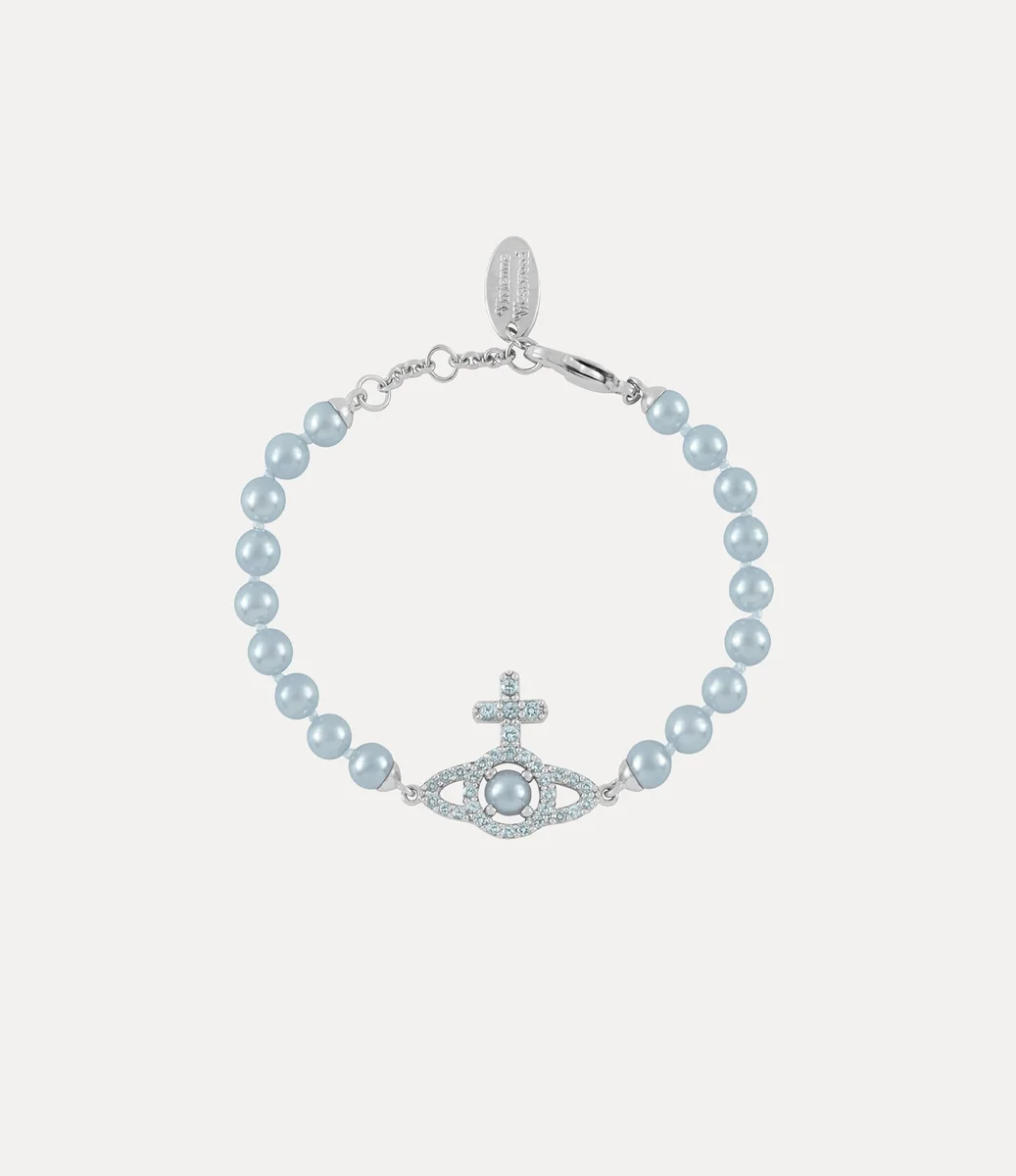 Parels blijven een essentieel element van de iconografie van het huis en roepen een gevoel van vervlogen luxe op. De Olympia Pearl-armband is geregen met blauwe glazen parels en heeft in het midden onze kenmerkende zilverkleurige bol, die rijkelijk is versierd met pavé-gezette kristallen.