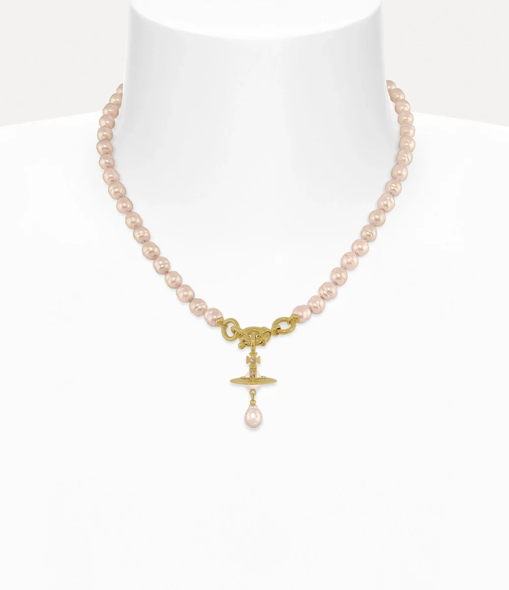 Parels blijven een essentieel element van de iconografie van het huis en roepen een gevoel van grandeur en luxe op. Onze Aleksa-ketting is voorzien van een rij handgeknoopte parels op basis van glas, compleet met een met kristallen ingelegd bolmotief en een barokke parel druppel.