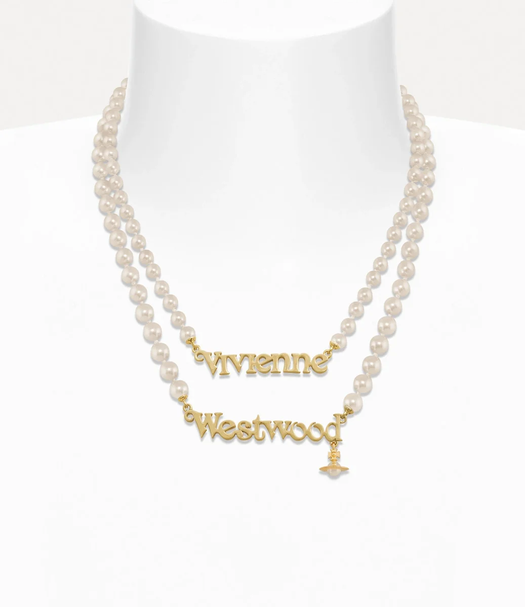 De Amelia ketting heeft twee rijen Swarovski-glasparels, versierd met de kenmerkende lettermotieven van het huis in goudkleurige plating. Het ontwerp sluit met een veilige karabijnsluiting, compleet met een hangend bolvormig bedeltje – dat het ethos weerspiegelt van het lanceren van het verleden in de toekomst.