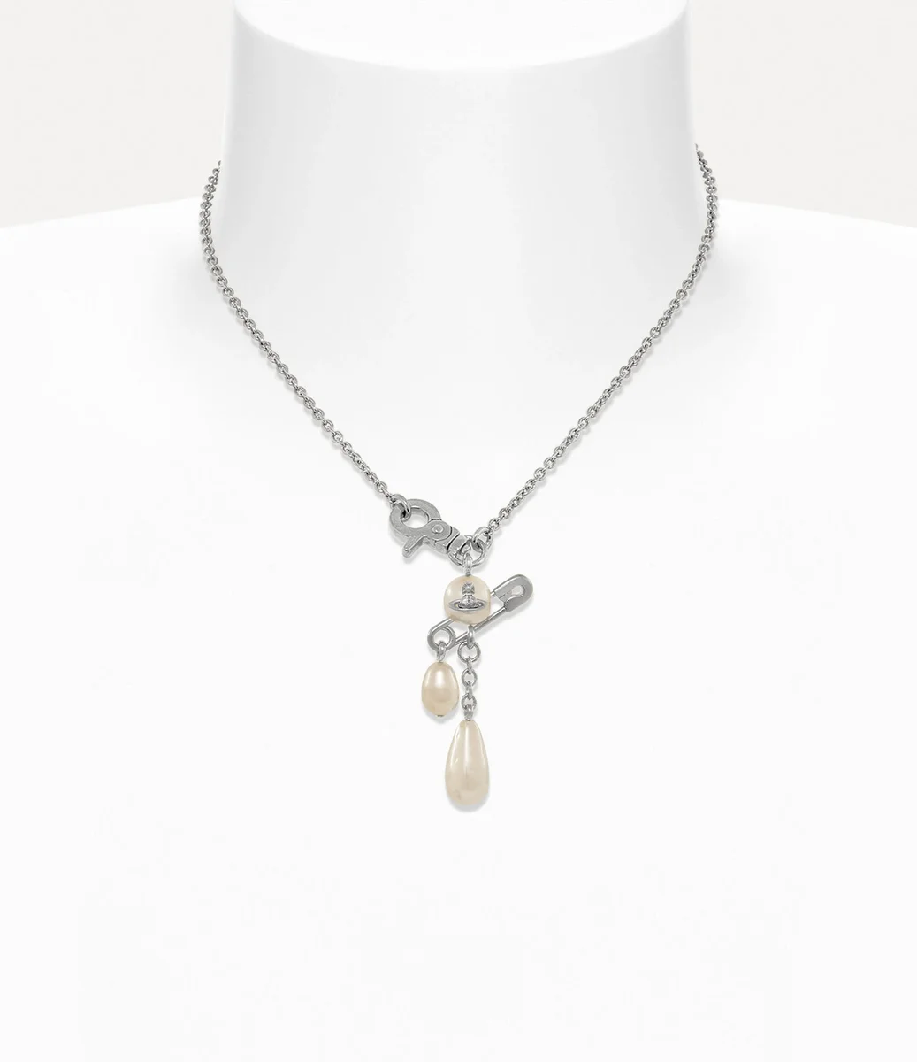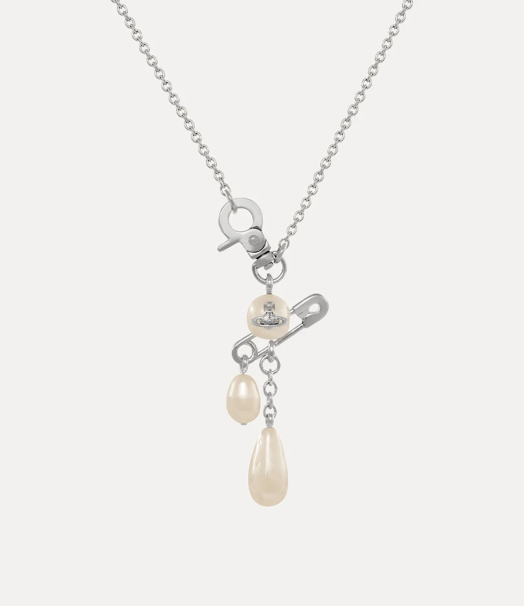 De Claude Small-ketting heeft een ronde parel met een centrale bol, geaccentueerd door een kenmerkend veiligheidsspelddetail – een knipoog naar Vivienne’s punk-geïnspireerde, non-conformistische stijl. Een parel druppel en delicate kettingdetails hangen elegant aan de hanger en voegen beweging toe aan het ontwerp, terwijl de op hardware geïnspireerde sluiting zorgt voor een gemakkelijke sluiting.