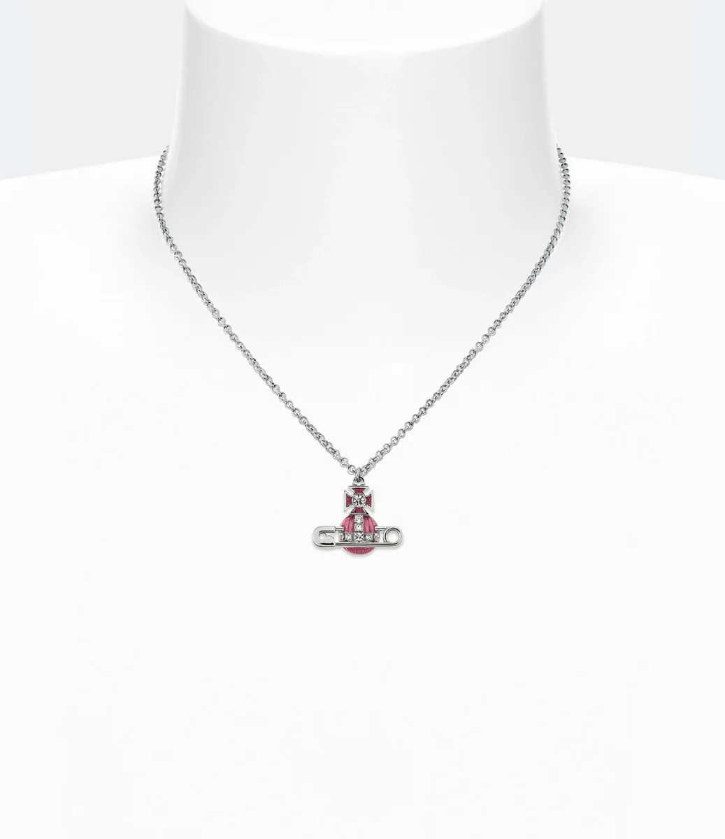Onze Kitty-hanger heeft ons klassieke bolembleem, met de hand beschilderd met doorschijnend roze email om het ingewikkelde metalen patroon eronder te onthullen. Het sieraad heeft een zilverkleurige afwerking en is voorzien van een veiligheidsspeldmotief, een symbool van non-conformisme dat doet denken aan Viviennes kenmerkende punkstijl.