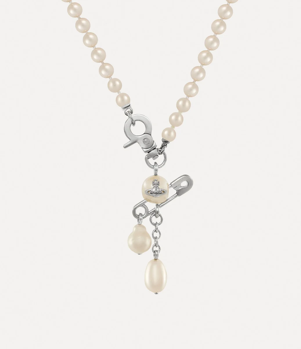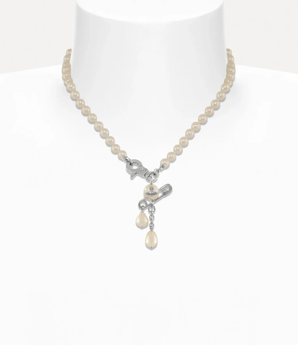 De archief Small Claude Pearl-ketting is dit seizoen vernieuwd met een enkele rij glinsterende Swarovski-glasparels, met een rond pareldetail in het midden, compleet met een klassieke veiligheidsspeld die door het ontwerp is gestoken – wat doet denken aan Vivienne’s kenmerkende punkesthetiek.