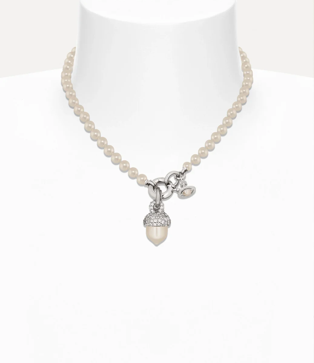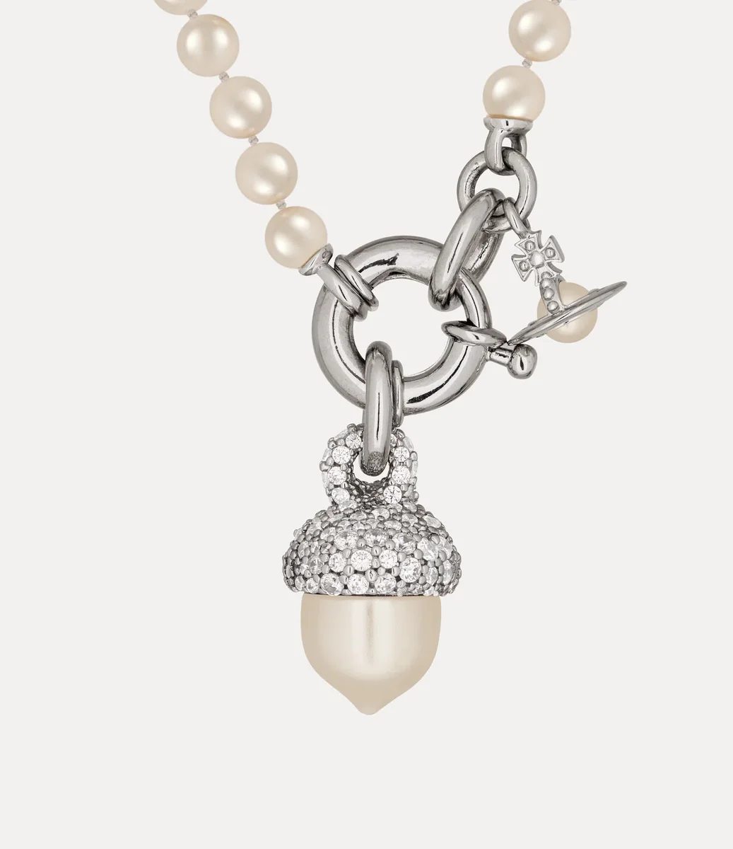 De Lucille Pearl ketting straalt grandeur en luxe uit, met een rij glinsterende Swarovski-glasparels. In het midden hangt een met pavé versierd eikelmotief met een glanzende parelafwerking naast een parelbol, omhuld door een gepolijst zilverkleurig metalen frame.