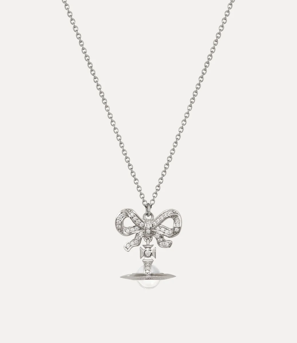 Onze Octavie-hanger is gemaakt van gerecycled zilver en afgewerkt met een gepolijste platina-kleurige coating. Het ontwerp is versierd met sprankelende witte kristallen en combineert een strik in Georgische stijl met onze kenmerkende driedimensionale bol in het midden, die verwijst naar het klassieke bolmotief van het huis.