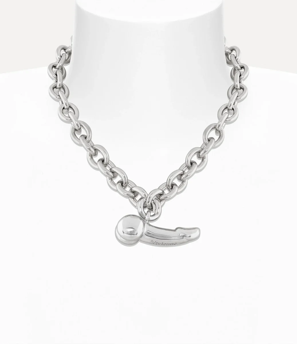 De Penis ketting verwijst naar Vivienne’s bewondering voor oude kunst, waarin het gedurfde motief vaak werd gebruikt om thema’s als vruchtbaarheid of kracht te symboliseren. Het sieraad is verkrijgbaar in een gepolijste, zilverkleurige afwerking, compleet met een dikke kabelketting en een veilige sluiting.