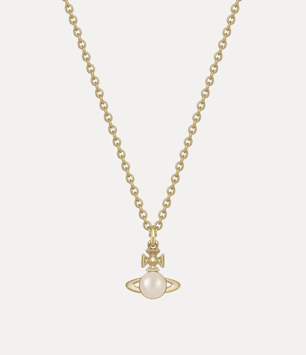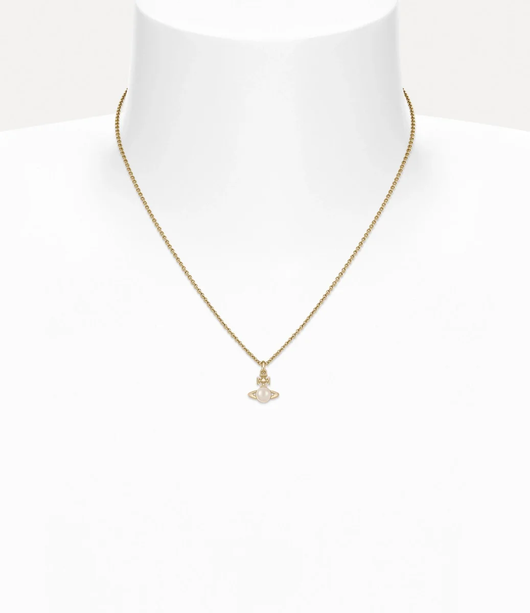 De Vivienne Westwood Balbina-hanger, in goudtinten, heeft een glasparel in het midden van de bolvormige hanger.