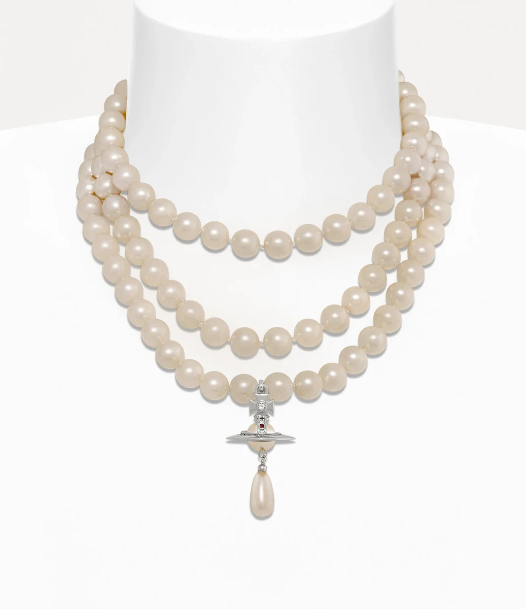 Eind jaren tachtig onthulde Vivienne Westwood haar parelconcept tijdens de Harris Tweed Fall 1987-modeshow, met een drievoudige choker. Onze Three Row Pearl Drop-choker is geïnspireerd op dit originele ontwerp en heeft een driedimensionaal bolmotief versierd met kristallen en een hangend druppelvormig pareldetail.