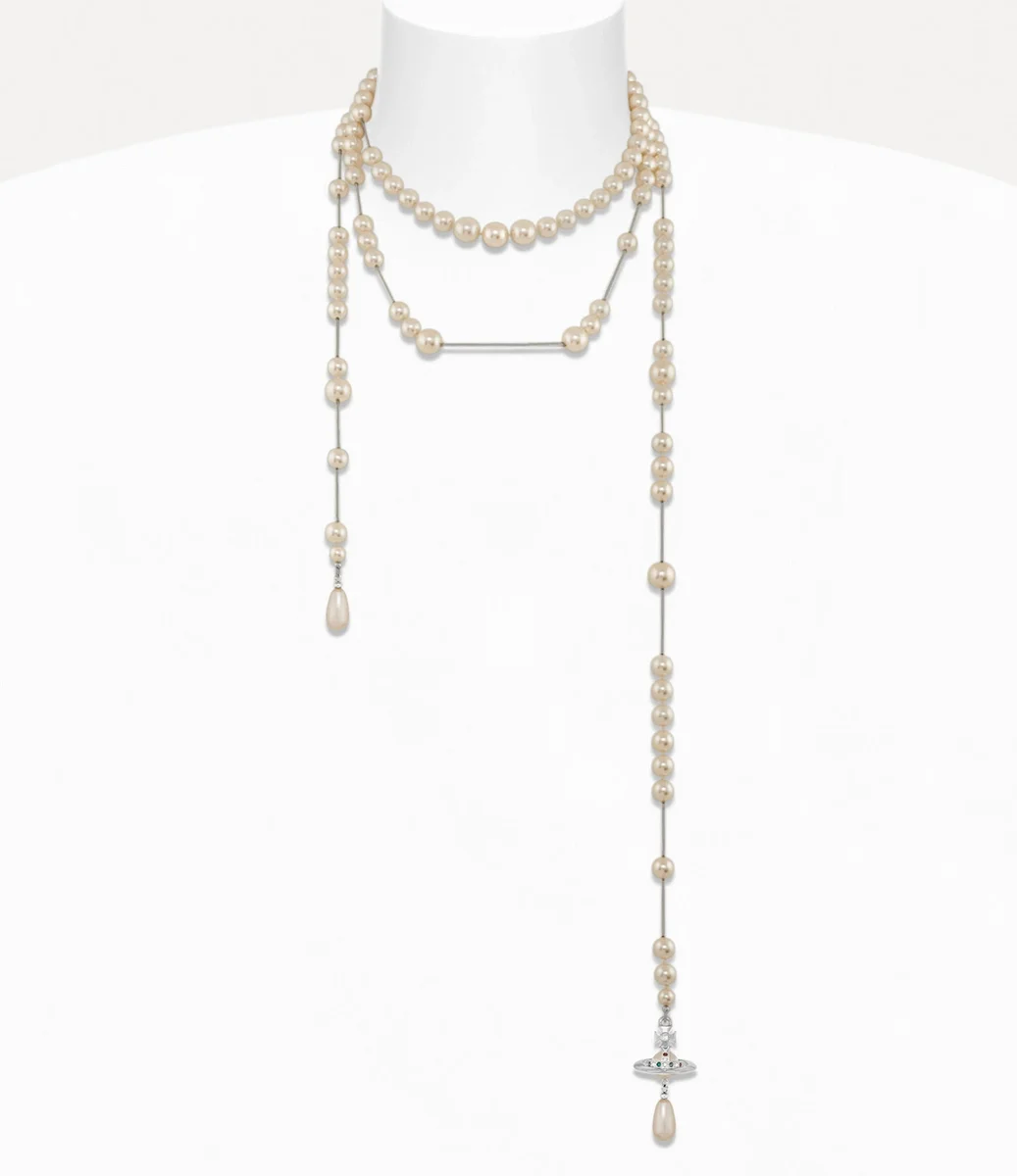 Parels zijn een essentieel element van de iconografie van het huis en roepen een gevoel van grandeur en luxe op. De Broken Pearl-ketting werd voor het eerst geïntroduceerd in de ‘Storm in a Teacup’-collectie voor herfst-winter 1996-97, geïnspireerd door de decoratieve patronen van de rococokunst. Dit sieraad is voorzien van glazen parels, met Vivienne’s kenmerkende ‘Broken’-elementen, ontworpen voor vrouwen die ‘de gruwel van uniformiteit en minimalisme onder ogen zagen’.