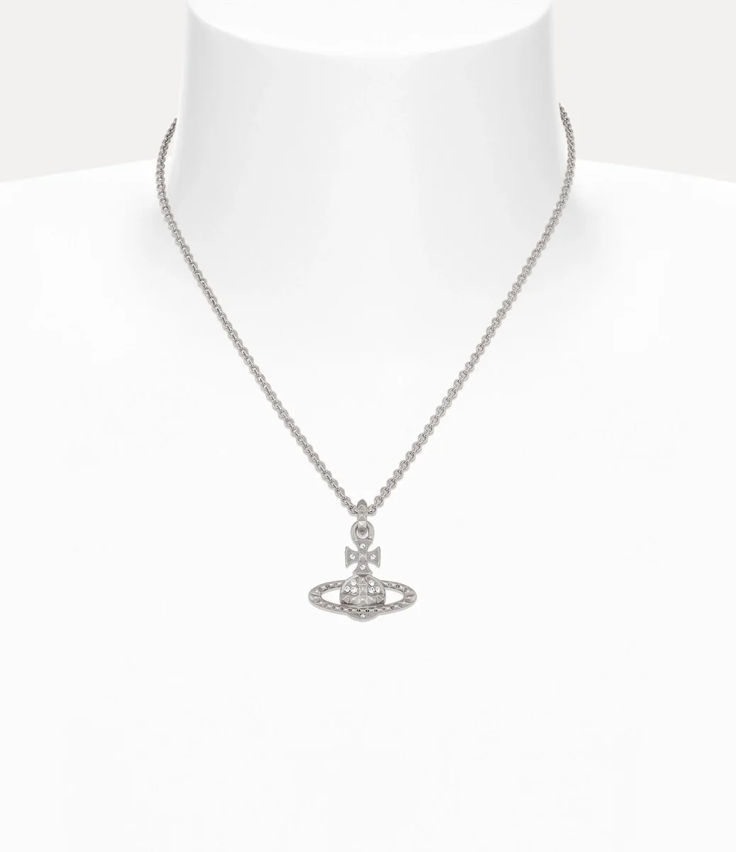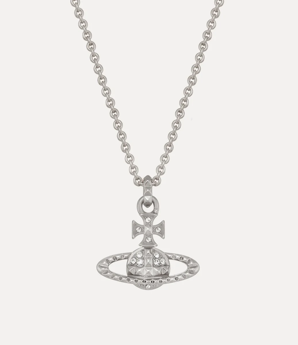 De Mayfair Bas Relief Pendant ketting keert dit seizoen terug met een zilverkleurige plating en glinsterende kristallen versieringen. Het sieraad heeft een bolvormig silhouet, synoniem voor de visie van het huis om traditie naar de toekomst te brengen, compleet met studdetails, symbolen van non-conformisme – in lijn met Vivienne’s kenmerkende punkbenadering.