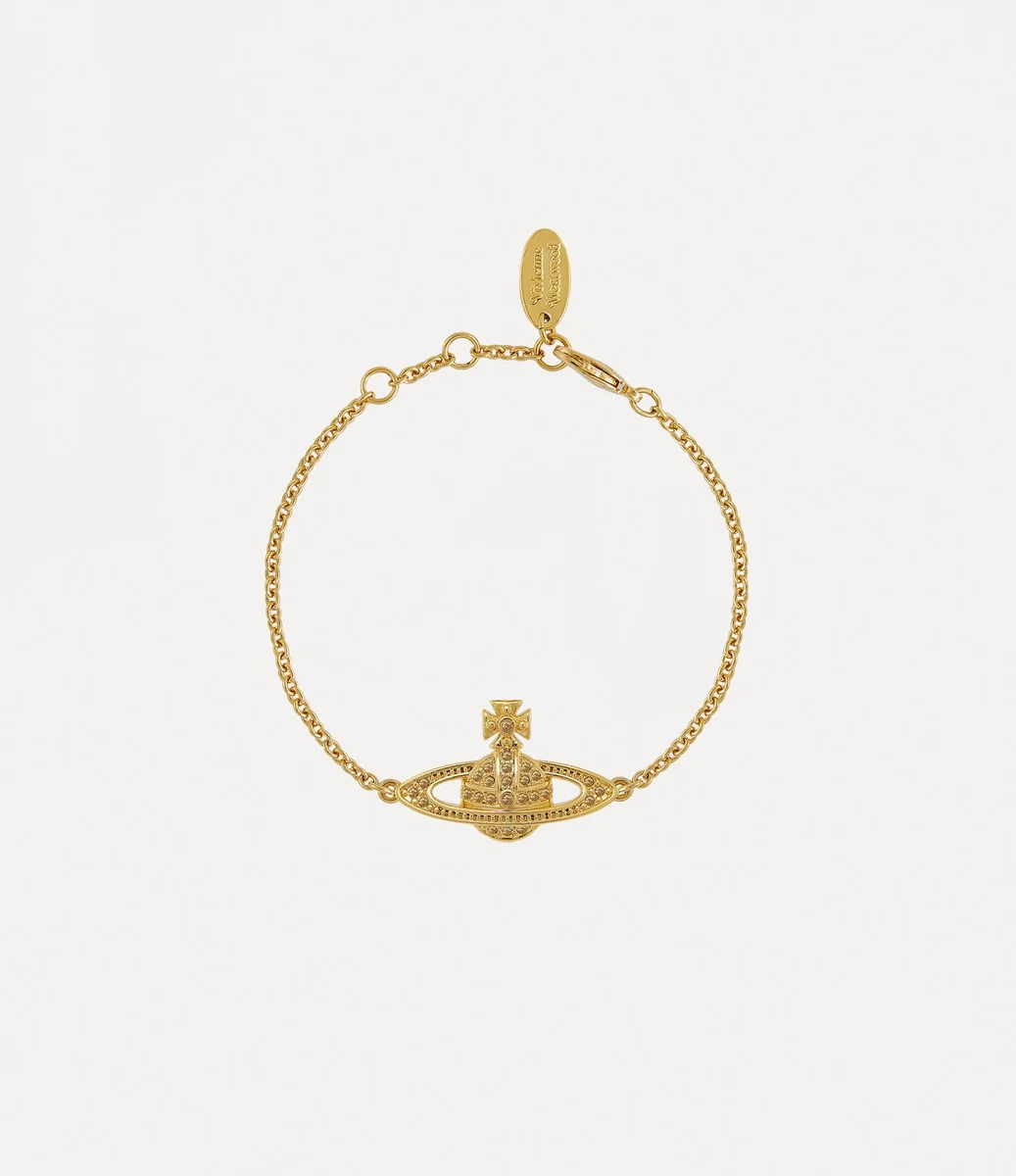 De Mini Bas Relief Chain-armband is gemaakt van goudkleurig metaal en heeft een orb-vormige bedel in het midden van de trace-ketting.