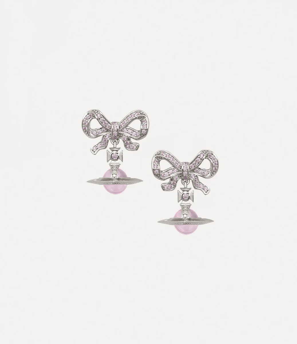 Onze Octavie-oorbellen hebben een strikvormig ontwerp dat is geïnspireerd op Georgische sieraden, versierd met pavé-gezette glinsterende kristallen in roze tinten. Het sieraad bevat het kenmerkende driedimensionale hangende bolmotief van het huis, afgewerkt in platina-kleurig zilver en met in het midden een delicate roze kristallen bol.