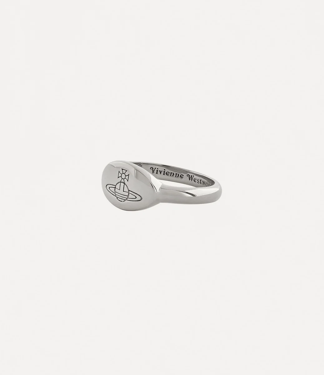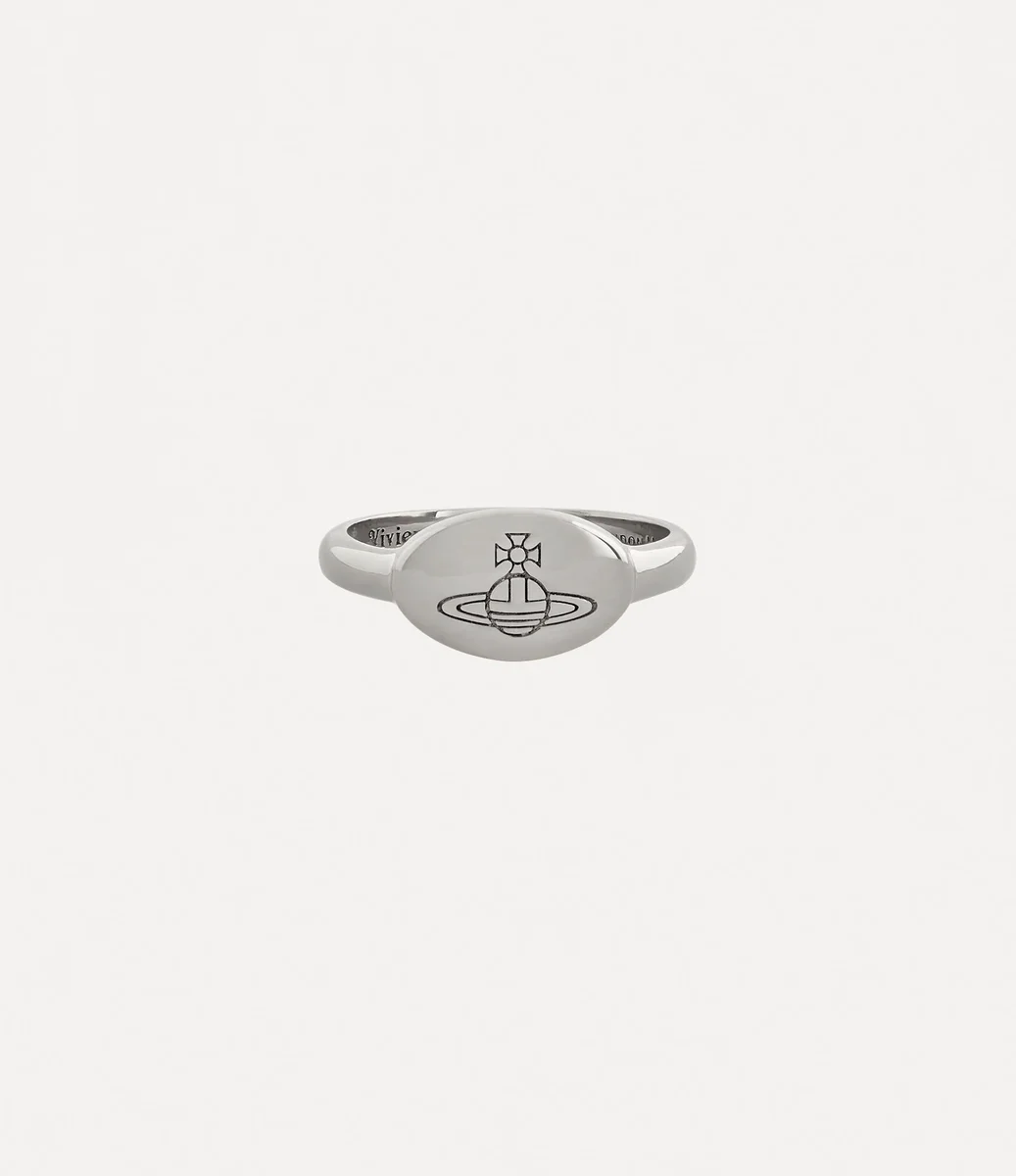 Onze Tilly-ring heeft een klassiek zegelringprofiel, is gemaakt van gerecycled zilver en afgewerkt met een gepolijste platina-kleurige plating. In het midden is het gegraveerde orb-motief met de hand beschilderd met zwarte emaille details, wat verwijst naar Vivienne’s visie om traditie naar de toekomst te brengen.