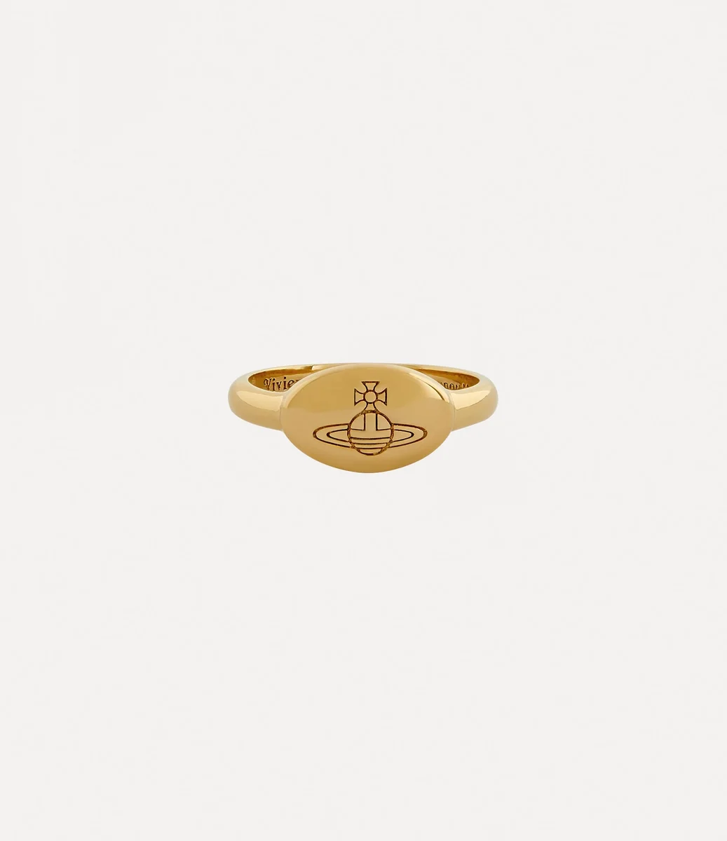 Onze Tilly-ring heeft een klassiek zegelringontwerp, afgewerkt met gerecycled zilver en verfraaid met een goudkleurige plating. Deze ring van Vivienne Westwood is versierd met een ovale voorkant, gegraveerd met onze kenmerkende orb-lijn en verrijkt met patina om de algehele esthetiek te versterken – een verwijzing naar Viviennes visie om traditie naar de toekomst te brengen.