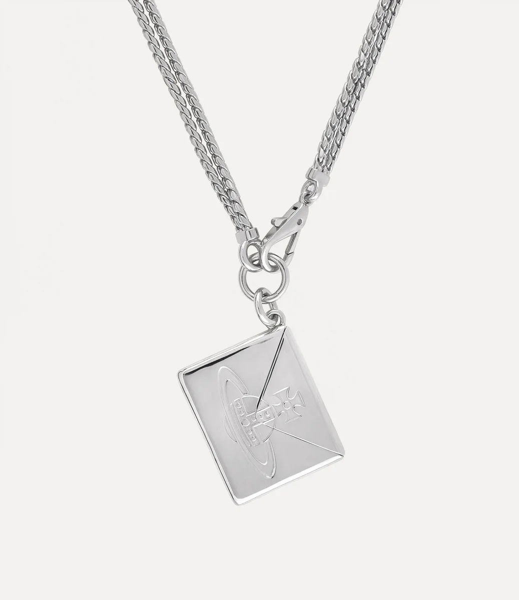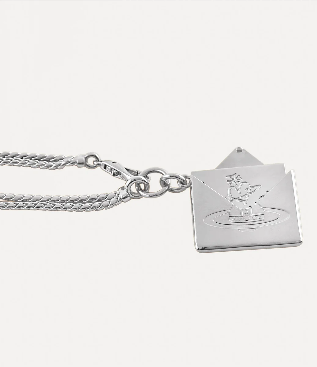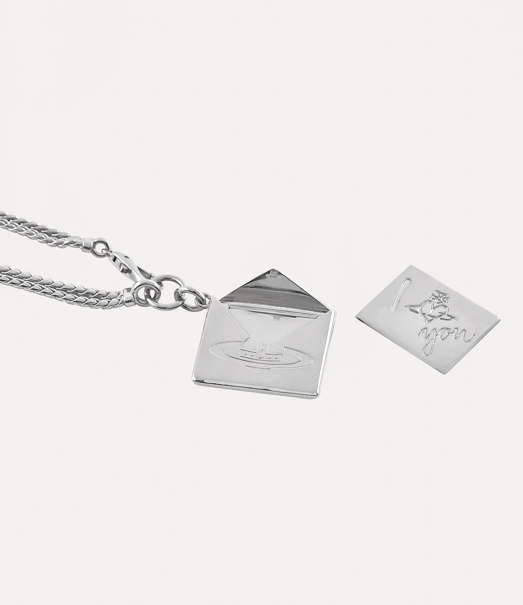 Onze Valentine’s Envelope Pendant ketting heeft een dubbel kettingsilhouet van verzilverd metaal, verfraaid met zwarte patina-details. De voorkant is voorzien van ons kenmerkende orb-motief, een symbool van Vivienne’s visie om traditie naar de toekomst te brengen, terwijl de achterkant is gegraveerd met de Vivienne Westwood flagship boutique. De ketting kan worden geopend en onthult een gegoten briefje met de hartelijke boodschap “I love you”.