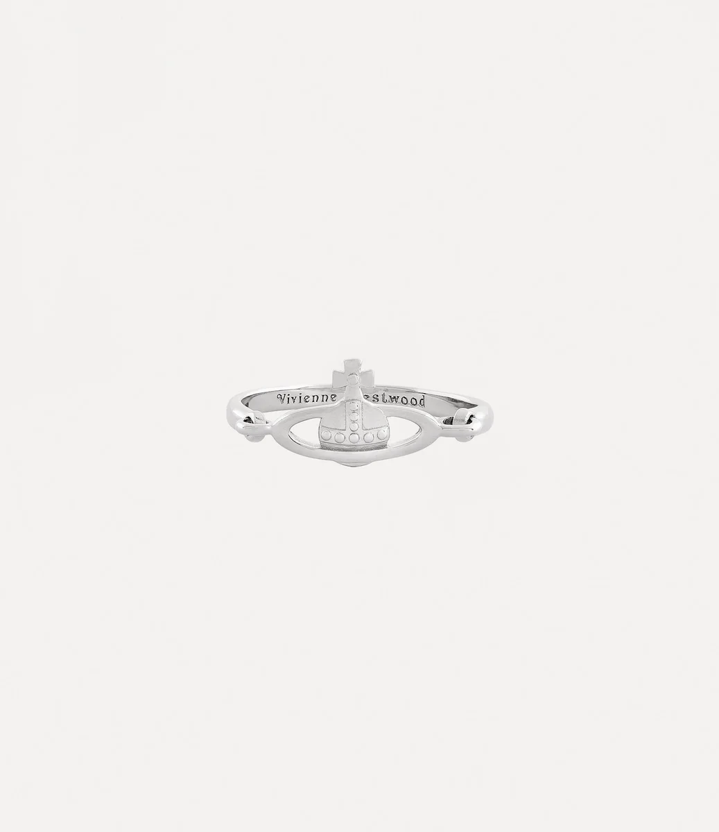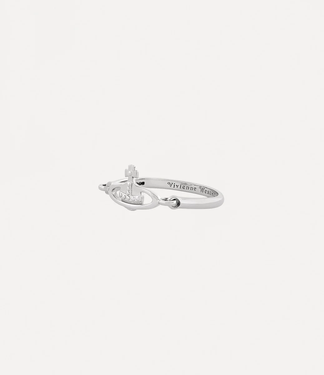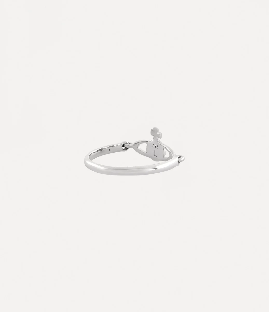 Onze Vendome-ring in platina-verguld zilver heeft een delicaat bandontwerp, compleet met een uitgesneden bolmotief op de voorkant dat op scharnieren kan draaien – synoniem voor Vivienne’s visie om traditie mee te nemen naar de toekomst. Als finishing touch is het sieraad aan de binnenkant gegraveerd met het kenmerkende typografiemotief van ons huis.
