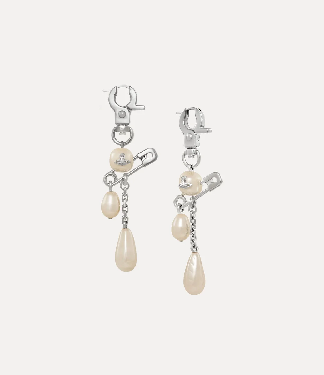 De zilverkleurige Claude Long oorbellen hebben een met een bol versierde parel in het midden van het ontwerp, doorboord met een veiligheidsspelddetail – een knipoog naar Vivienne’s punkesthetiek. Het sieraad heeft een druppelvormig silhouet, compleet met een op hardware geïnspireerde sluiting en een veilige scharnierende stekker.