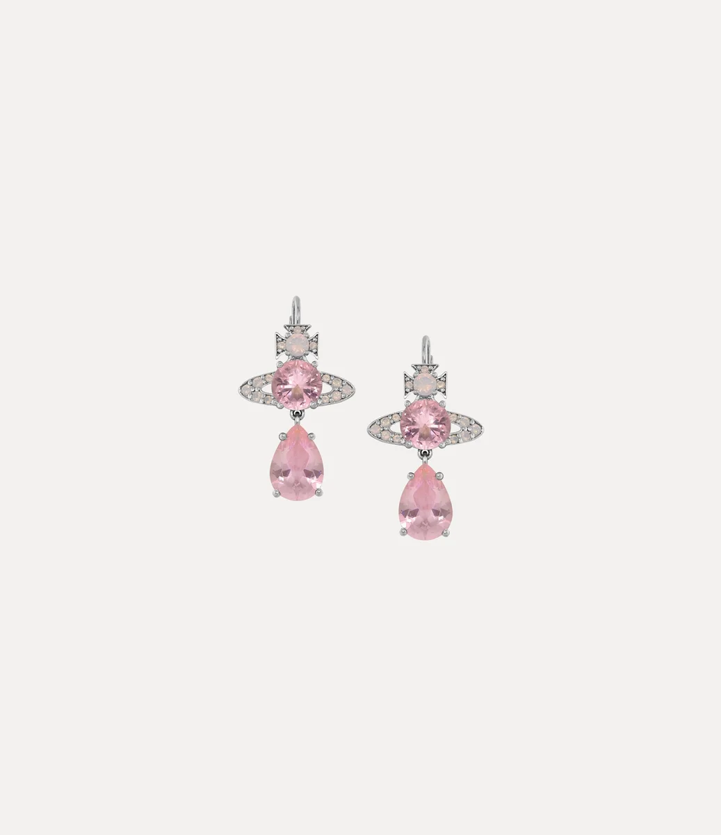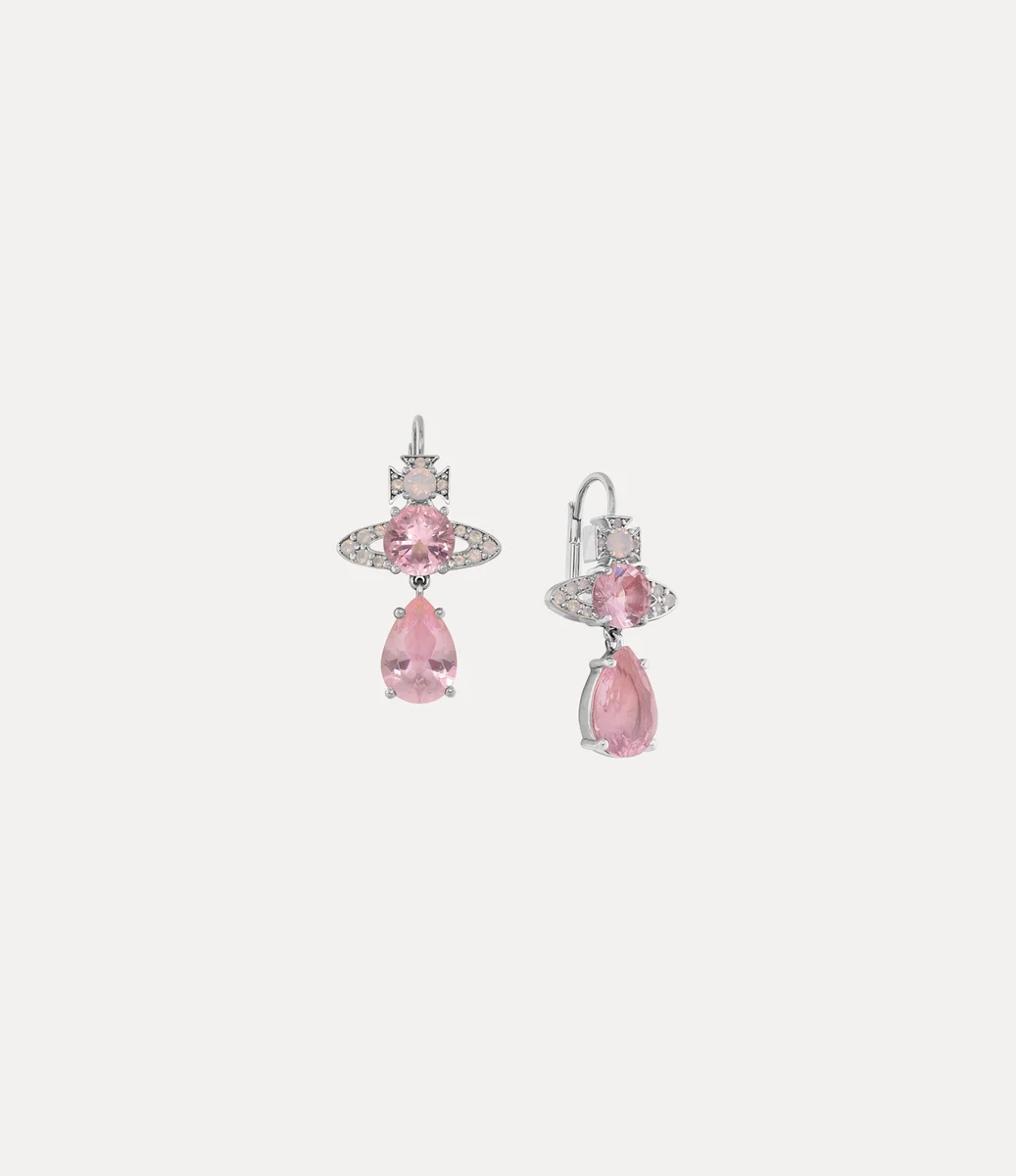 Onze Ismene Drop oorbellen zijn gemaakt van zilverkleurig metaal, met een gefacetteerde roze edelsteen in het midden van elke bol en een druppelvormige steen eronder. De Saturnusring is versierd met delicate roze kristallen, terwijl het kruis aan de bovenkant is versierd met een melkachtig, iriserend edelsteendetail.