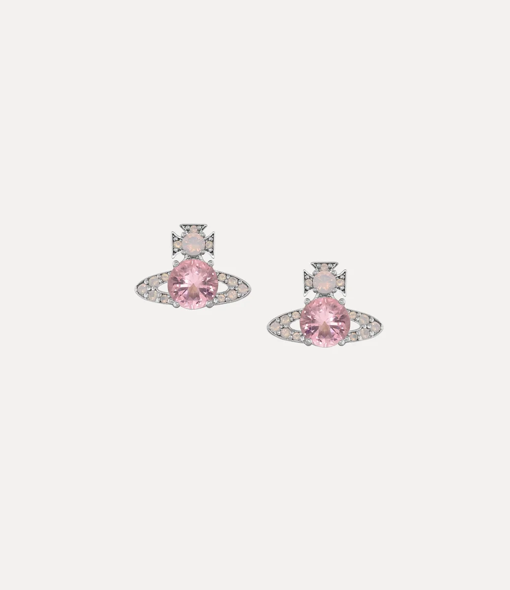 Onze Ismene oorbellen zijn gemaakt van gepolijst zilverkleurig metaal, afgewerkt met een grote, gefacetteerde roze edelsteen in het midden van elke oorbel. De Saturnusring van het bolontwerp is versierd met delicate roze kristallen, terwijl het kruis aan de bovenkant is bezet met een melkachtige, iriserende edelsteen.