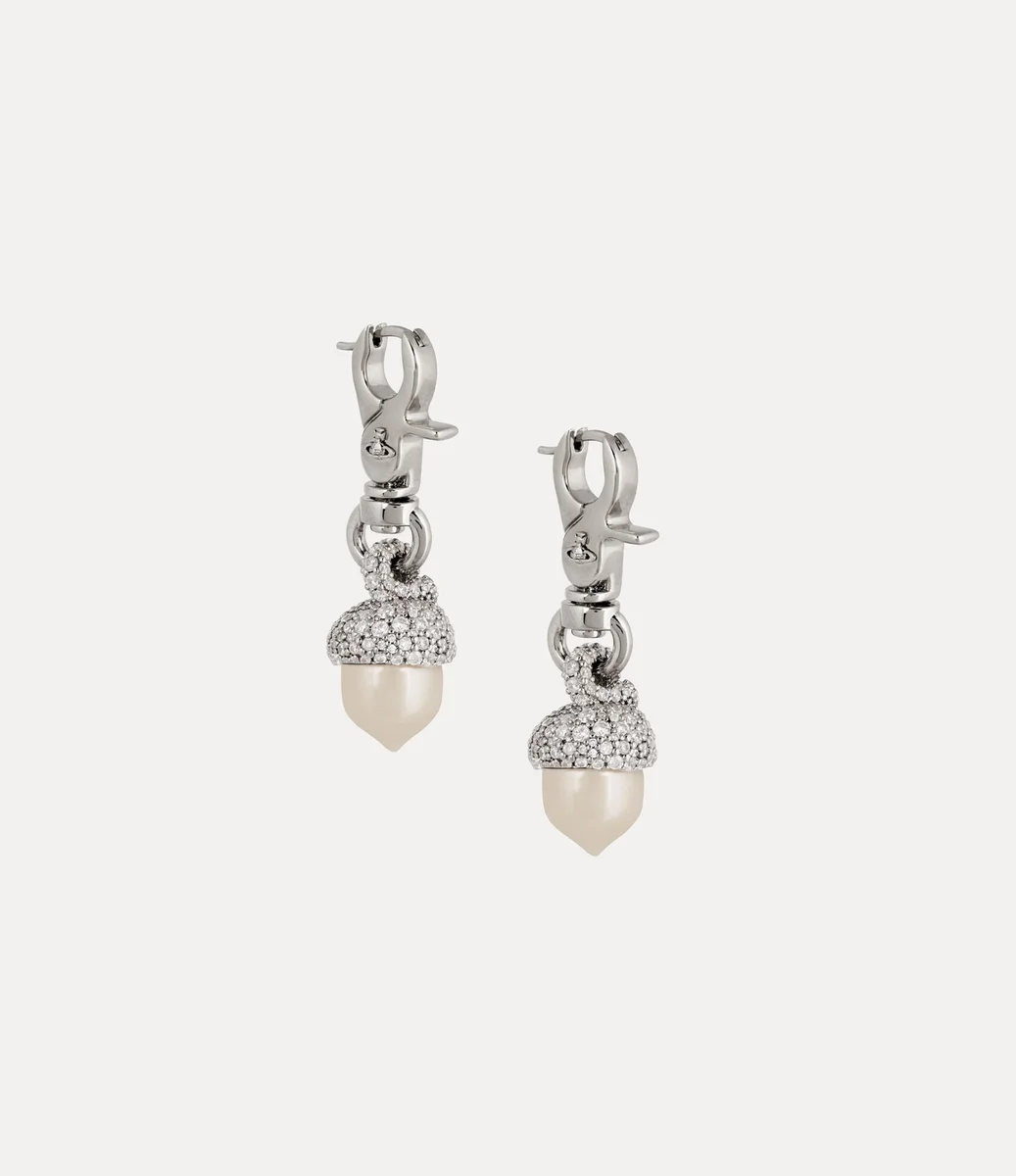 De Lucille Large oorbellen hebben een draaibare sluiting in hardware-stijl met een veilige scharnierende stekker, voorzien van het traditionele eikelmotief met een glanzende parelmoeren basis en een met pavé-kristallen versierde kap. Het ingewikkelde orb-logo dat op de sluiting is gegraveerd, maakt het ontwerp compleet en weerspiegelt Vivienne’s visie om traditie naar de toekomst te brengen.