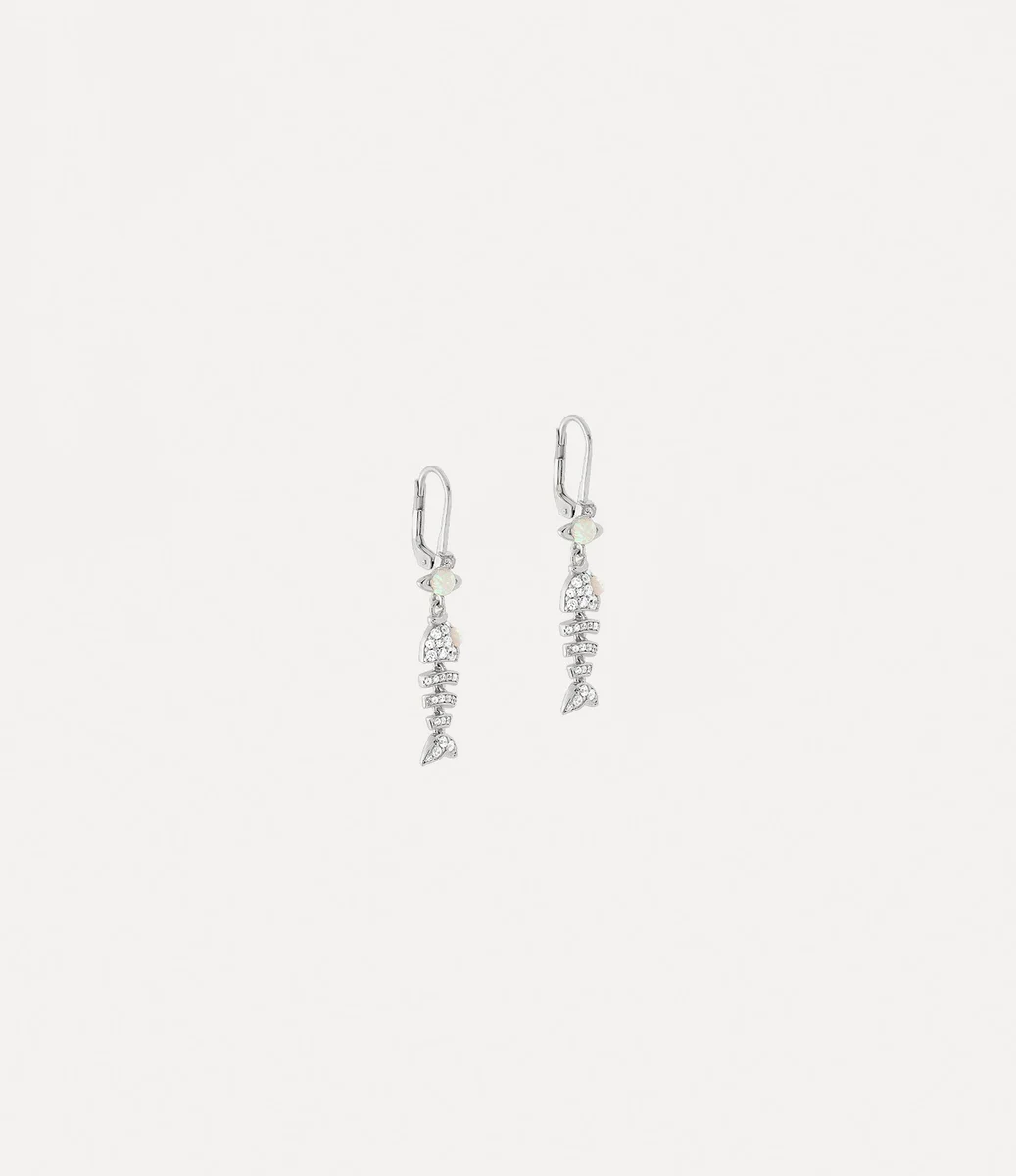 Het visgraatmotief is een kenmerkend icoon van het huis geworden en is in veel collecties door de jaren heen teruggekomen. De Lyall-oorbellen blazen het motief nieuw leven in, versierd met witte kristallen details en opaalachtige edelstenen, afgewerkt in platina-verguld zilver.