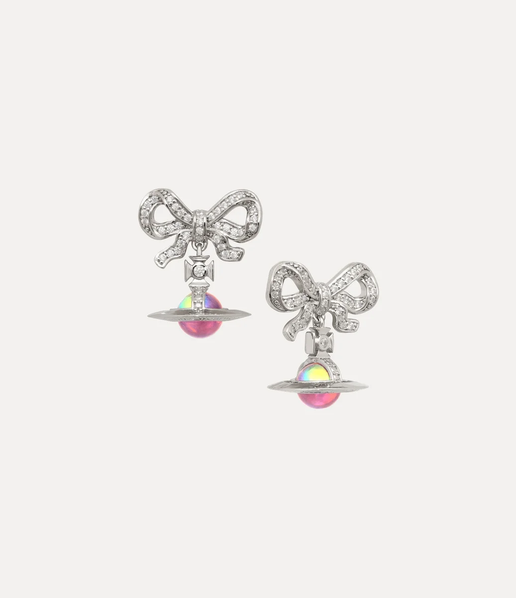 Onze Octavie-oorbellen zijn gemaakt van gerecycled zilver en afgewerkt met een gepolijste platina-kleurige coating. Het ontwerp is versierd met sprankelende witte kristallen en combineert een strik in Georgische stijl met onze kenmerkende driedimensionale bol in het midden, uitgevoerd in een roze iriserende afwerking, die het klassieke bolmotief van het huis weerspiegelt.