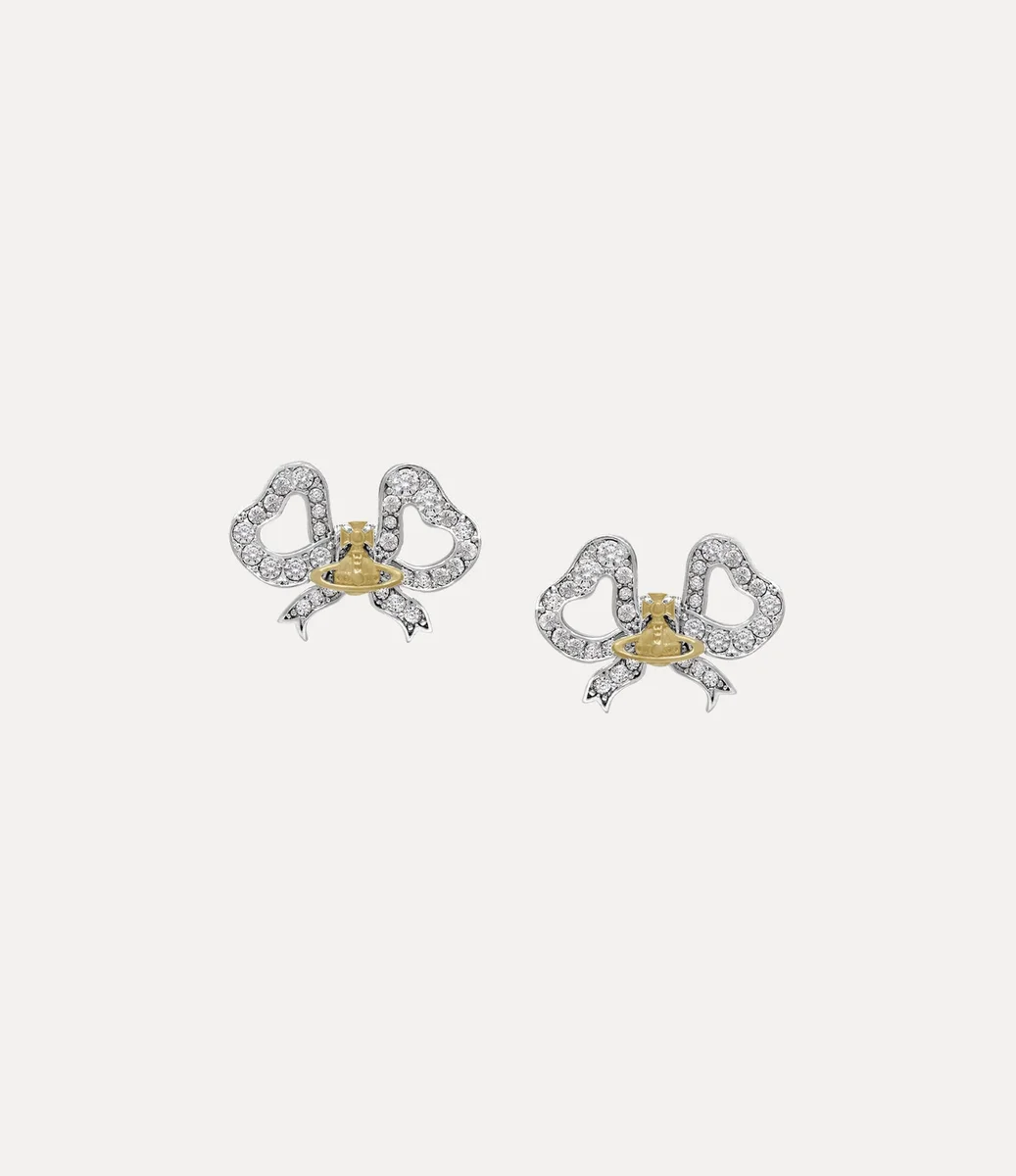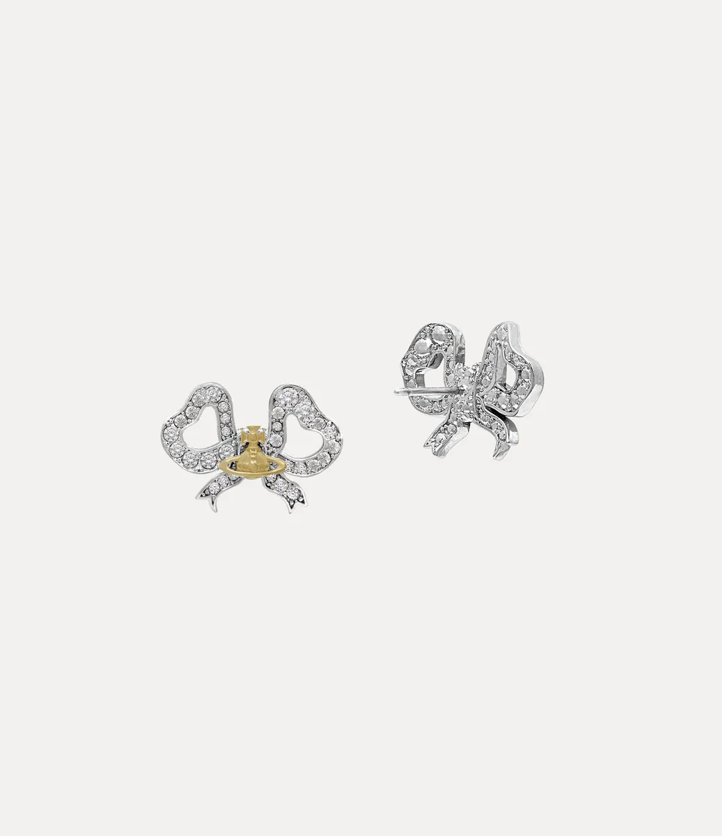 De strikvorm is een kenmerkende stijl van het huis geworden en is in veel collecties door de jaren heen teruggekomen. De Rigoberta oorbellen hebben een gedetailleerd silhouet in Georgische stijl, versierd met sprankelende witte kristallen die een contrasterend bolmotief in het midden elegant omlijsten, synoniem voor Vivienne’s visie om traditie naar de toekomst te brengen.