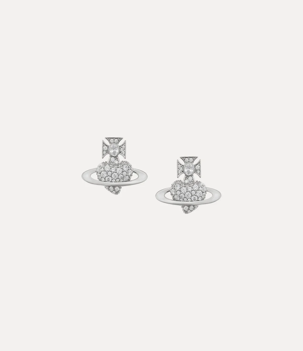 De Valentine’s Agnatha oorbellen hebben een asymmetrisch hartvormig silhouet, een symbool van Vivienne’s liefde voor de mensheid en de planeet. Het sieraad is versierd met glinsterende kristallen accenten in witte tinten, afgewerkt met gepolijste zilverkleurige plating en handgeschilderde witte emaille details binnen de hemelse ring van Saturnus.