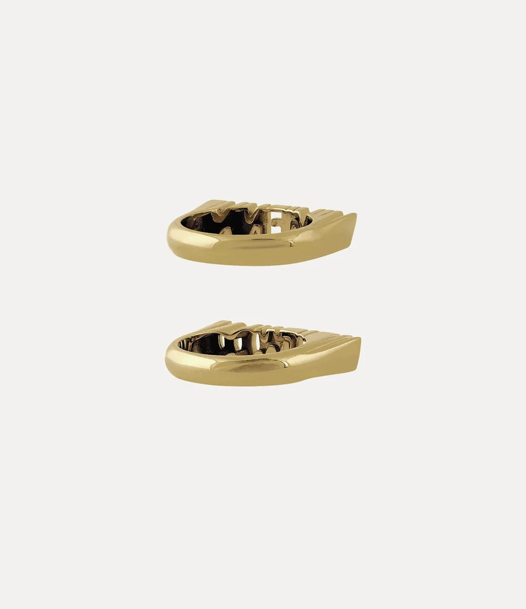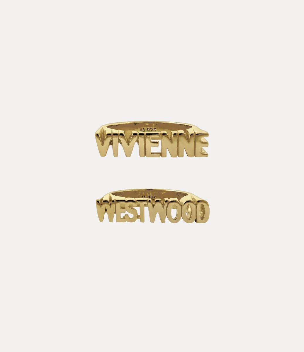 Onze Essex-ring is gemaakt van gerecycled zilver en afgewerkt met een gepolijste goudkleurige plating. Het ontwerp bestaat uit twee opvallende, volledig metalen banden, één met het woord ‘Vivienne’ en de andere met ‘Westwood’, en wordt geaccentueerd door gedetailleerde uitsparingen die de contouren van elke letter volgen.
