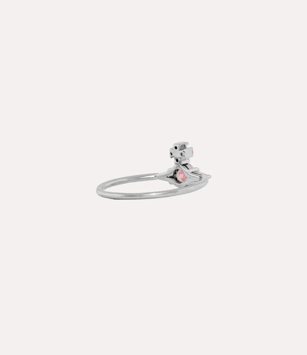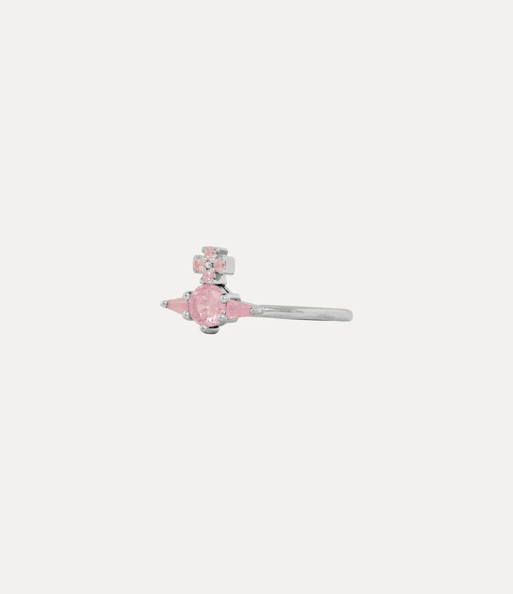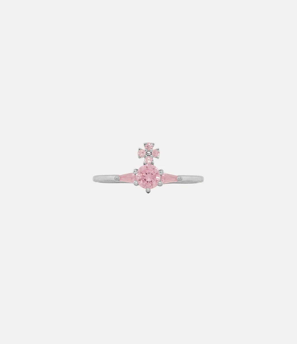 Onze Ofelia-ring is gemaakt van platina-kleurig zilver en heeft in het midden een delicaat orb-motief, geïnspireerd op het kenmerkende embleem van het huis. Het ontwerp is bezet met een rondgeslepen roze kristal, omlijst door taps toelopende baguette-kristallen en pavé-details aan de bovenkant van het kruis, waarmee Vivienne’s visie om traditie naar de toekomst te brengen wordt belichaamd.
