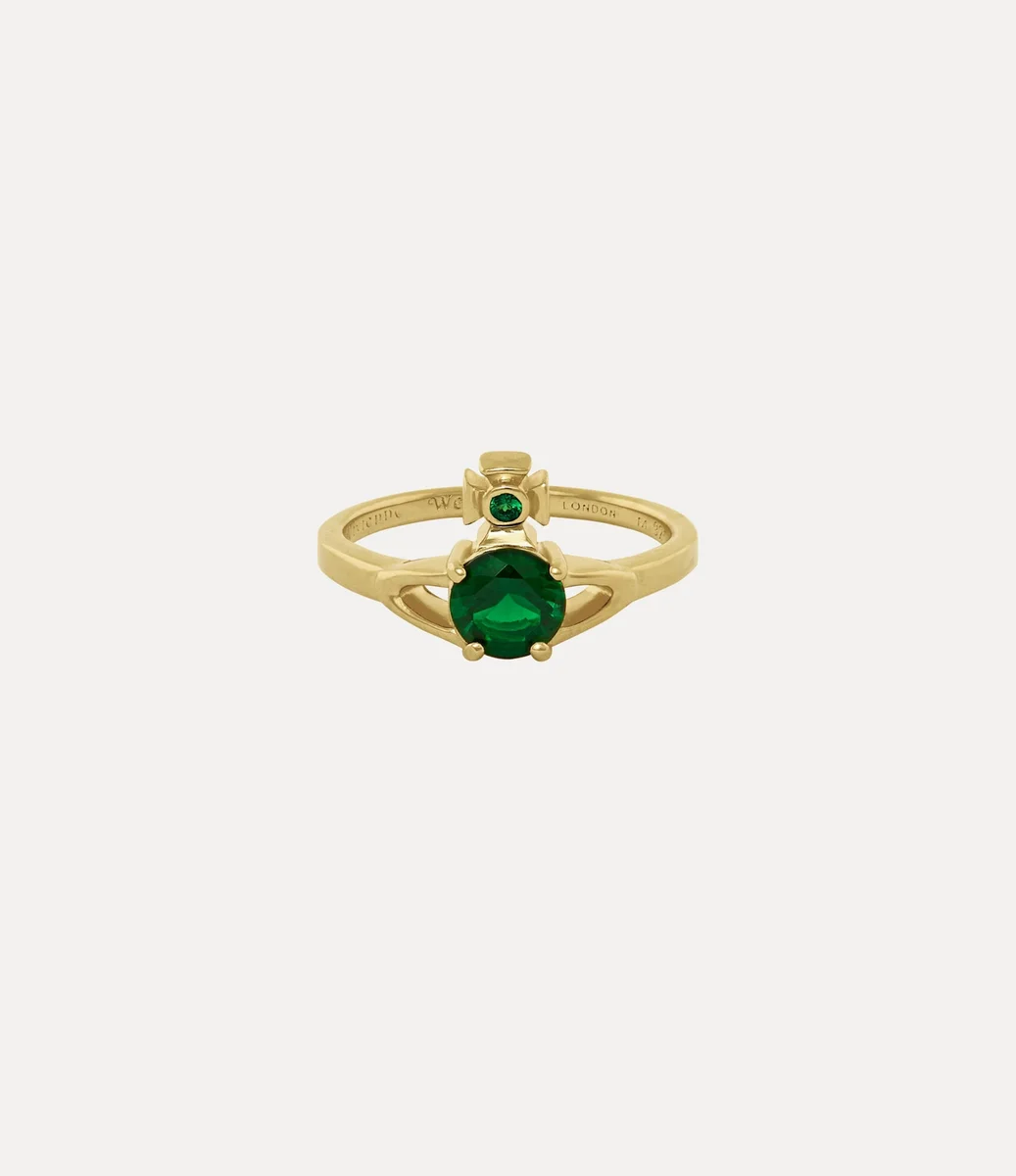 Onze Reina Petite-ring is verkrijgbaar in gerecycled zilver, afgewerkt met een glanzende goudkleurige finish en groene kristallen versieringen. Het sieraad heeft een bolvormig gezicht, dat traditie vertegenwoordigt, omringd door de hemelse ringen van Saturnus, die de toekomst symboliseren.