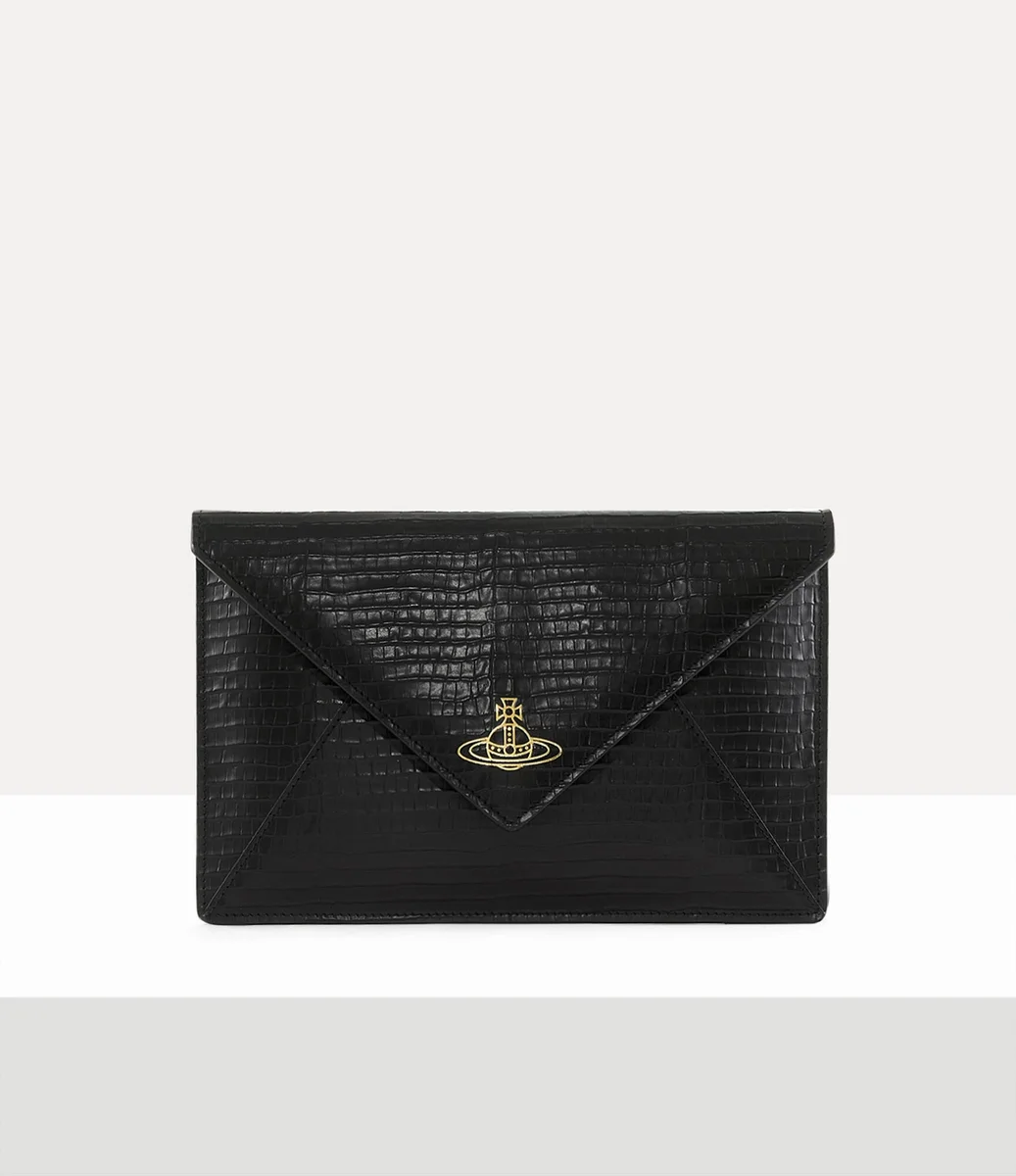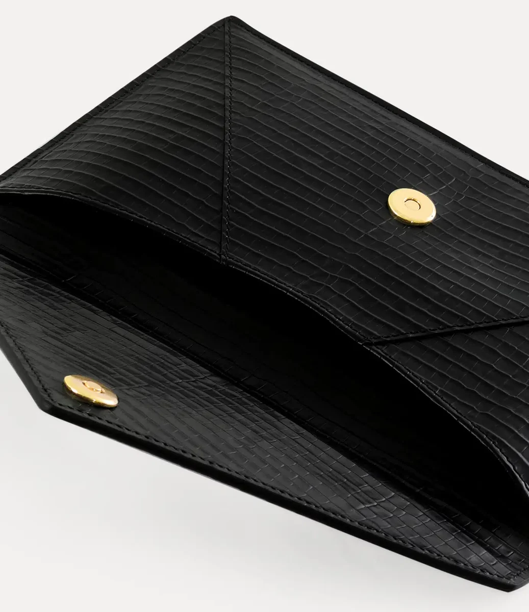 Dit seizoen is onze Envelope-clutch opnieuw ontworpen in het subtiele mini-krokodillenleer van dit seizoen, met het kenmerkende orb-motief op de sluiting. Het ontwerp is afgewerkt met delicate goudfolie-reliëf en is geïnspireerd op antieke leren tafelbladen en vintage juwelendoosjes.