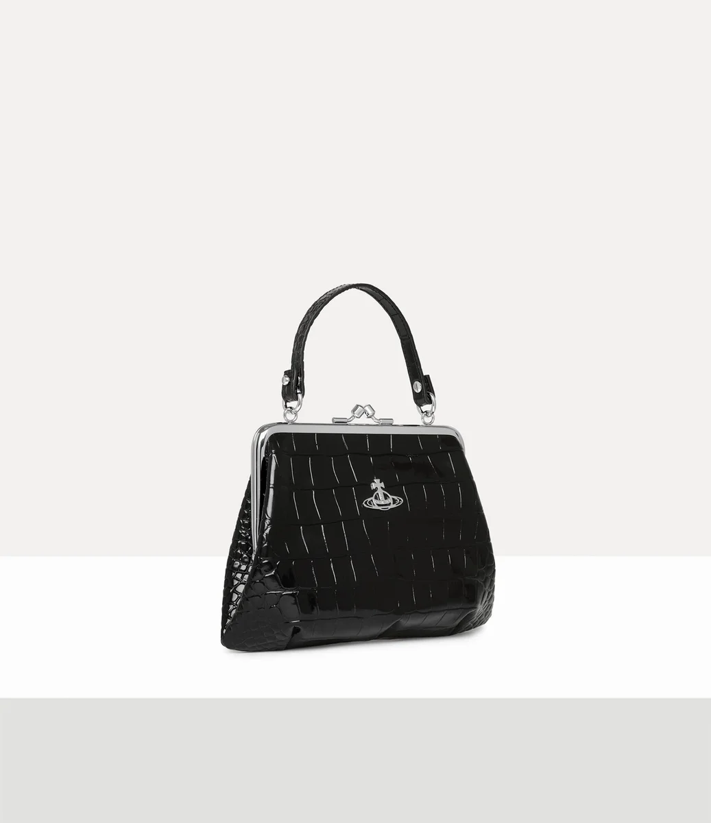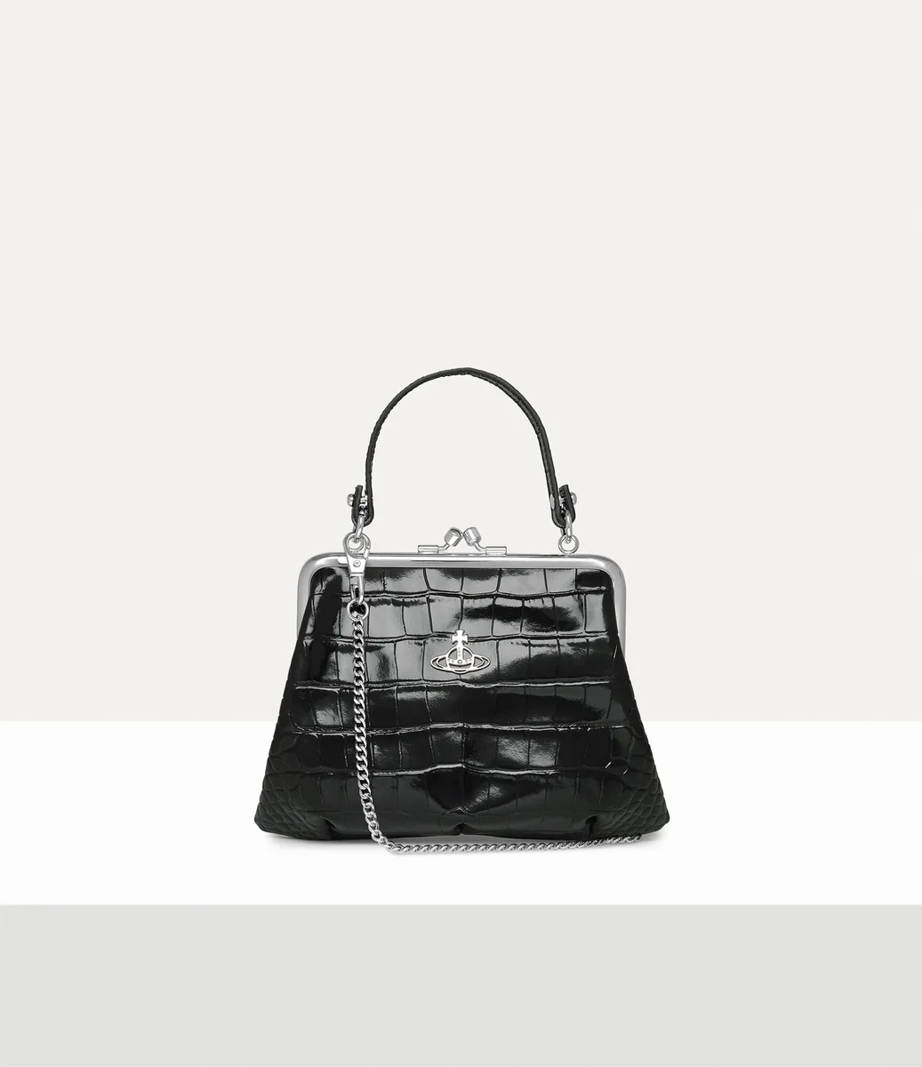 Het silhouet van de Granny Frame-tas doet denken aan antieke portemonnees uit het begin van de 20e eeuw, met een metalen frame en een veilige kiss-lock sluiting. Het ontwerp is voorzien van een krokodillenprint en wordt gecompleteerd door ons klassieke orb-motief op het voorpaneel, dat synoniem staat voor het ethos van het huis om het verleden naar de toekomst te brengen.