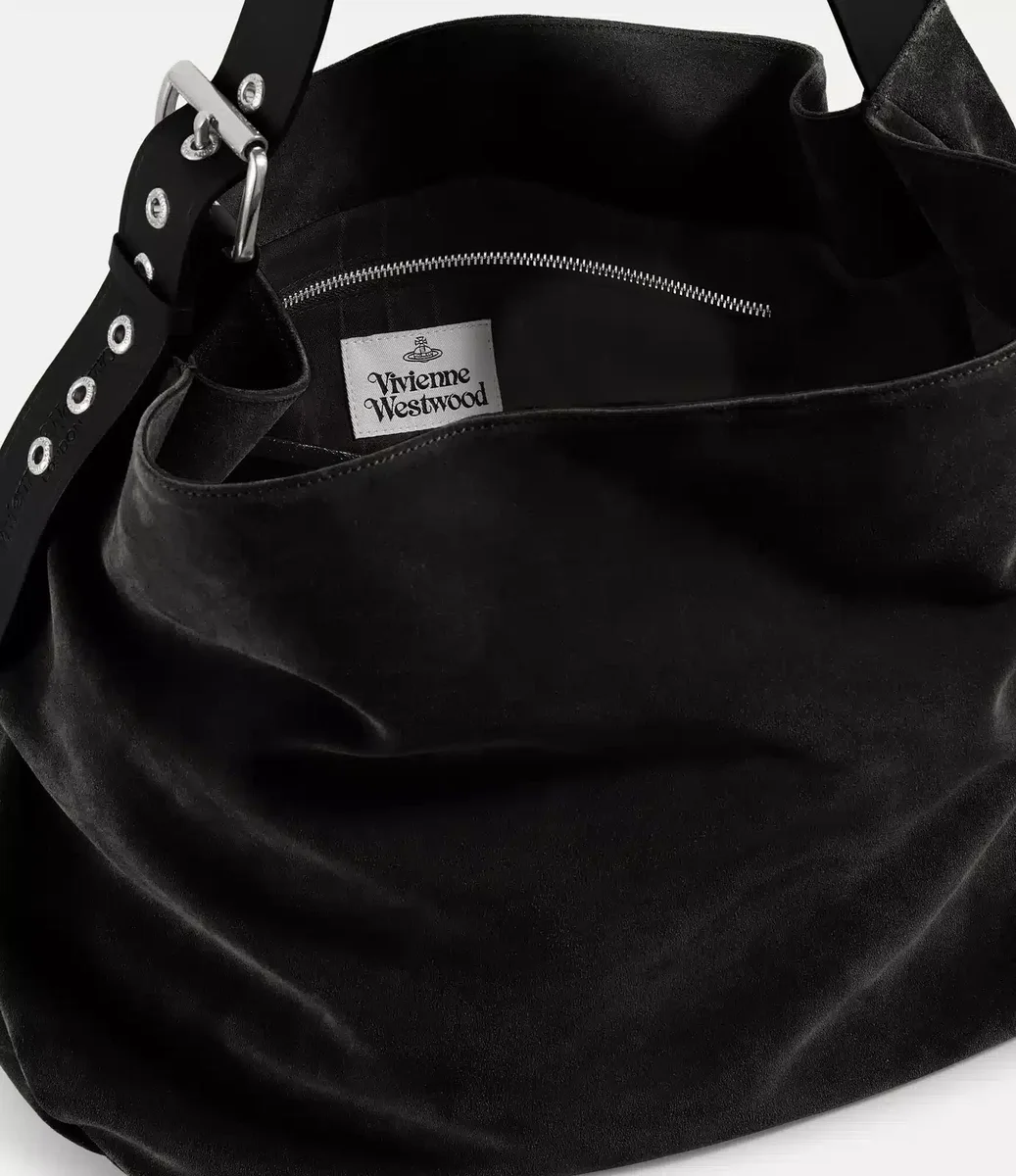 Onze Maxime grote schoudertas heeft een suède leren profiel, compleet met een gegraveerde rolgespsluiting en een rij zilverkleurige oogjes langs de schouderriem – die doen denken aan het ontwerp van de iconische Alex-riem van het huis. Het item is afgewerkt met een magnetische druksluiting en heeft een binnenvak met ritssluiting.