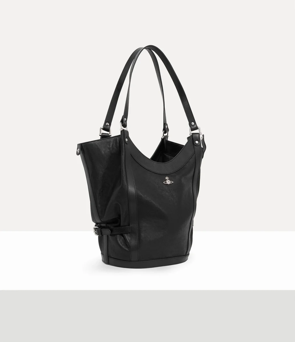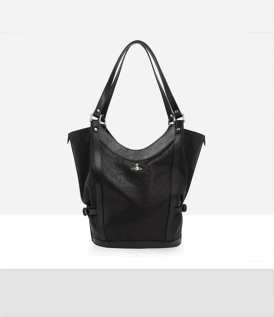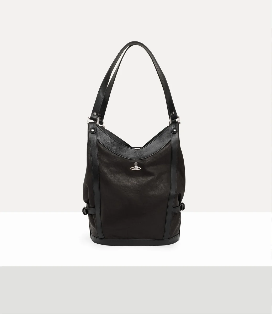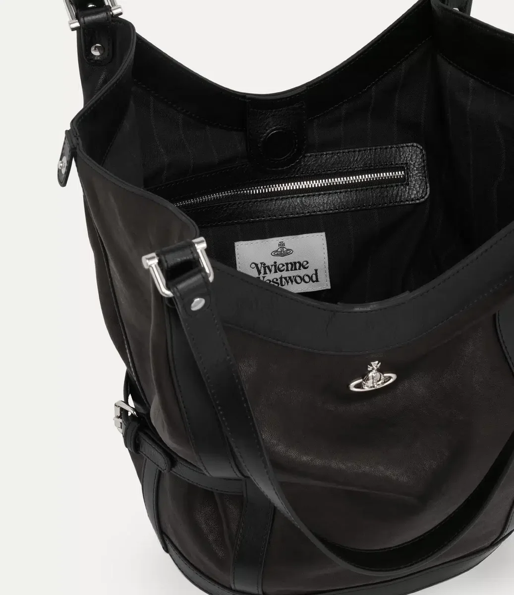 De Olive Large schoudertas is gemaakt van soepel leer en gevoerd met ons kenmerkende ‘Broken Pinstripe’-patroon, dat voor het eerst werd geïntroduceerd in de Gold Label herfst-wintercollectie 2015 van Vivienne. Het ontwerp heeft een zacht, slouchy silhouet en is gedetailleerd met bondage-achtige riemen die de vorm als een harnas vastzetten.