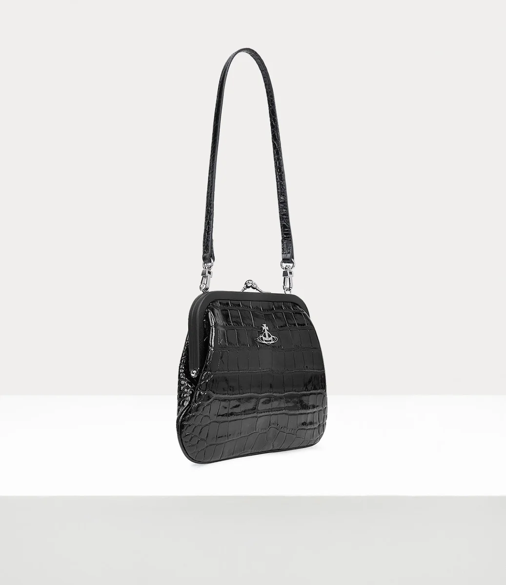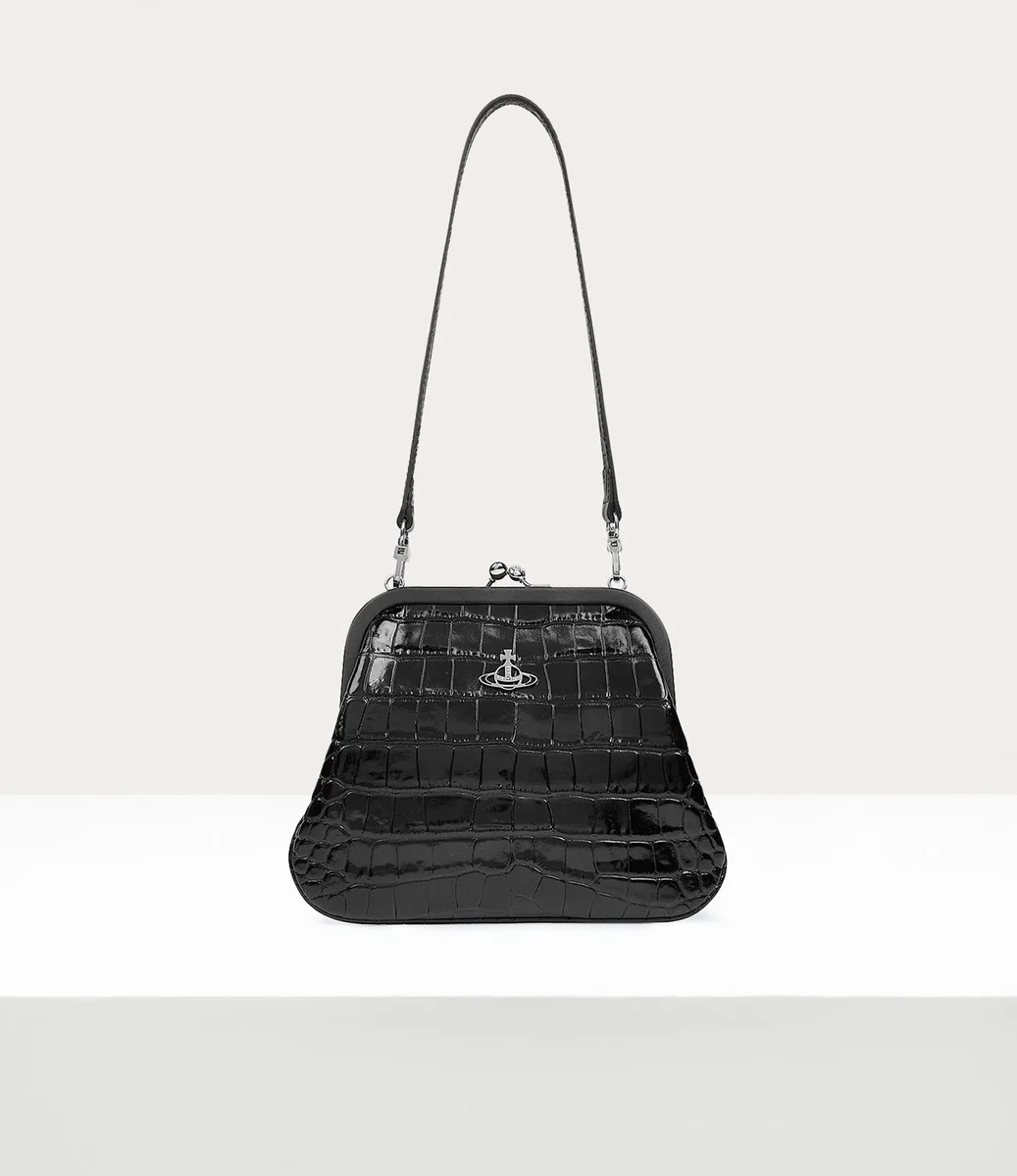 Onze Vivienne-clutch is verkrijgbaar in glanzend leer, met een vintage-geïnspireerd kiss-lock-frame en krokodillenreliëf over het hele ontwerp. Het stuk is vernoemd naar Vivienne, die dol was op deze stijl, en is versierd met ons kenmerkende ‘Line Orb’-motief op het voorpaneel.