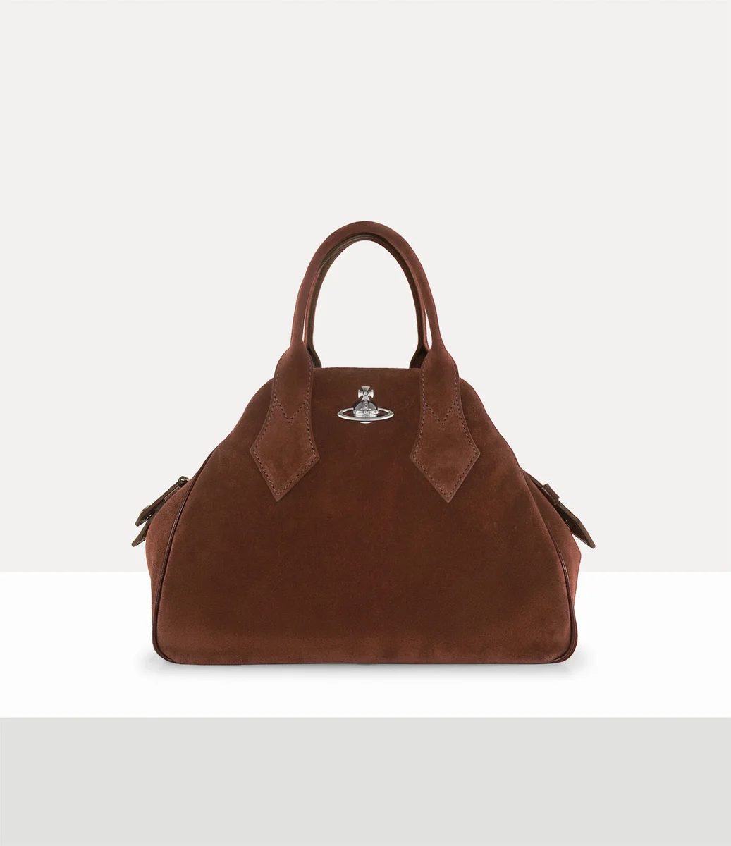 Onze Yasmine Medium-tas is opnieuw ontworpen in soepel suède leer, compleet met een silhouet met dubbele handgrepen aan de bovenkant. De binnenkant is gevoerd met het kenmerkende ‘Broken Pinstripe’-motief van het huis – een herinterpretatie van het klassieke krijtstreepmotief, dat voor het eerst werd geïntroduceerd in de Vivienne Westwood Gold Label herfst-wintercollectie 2015.