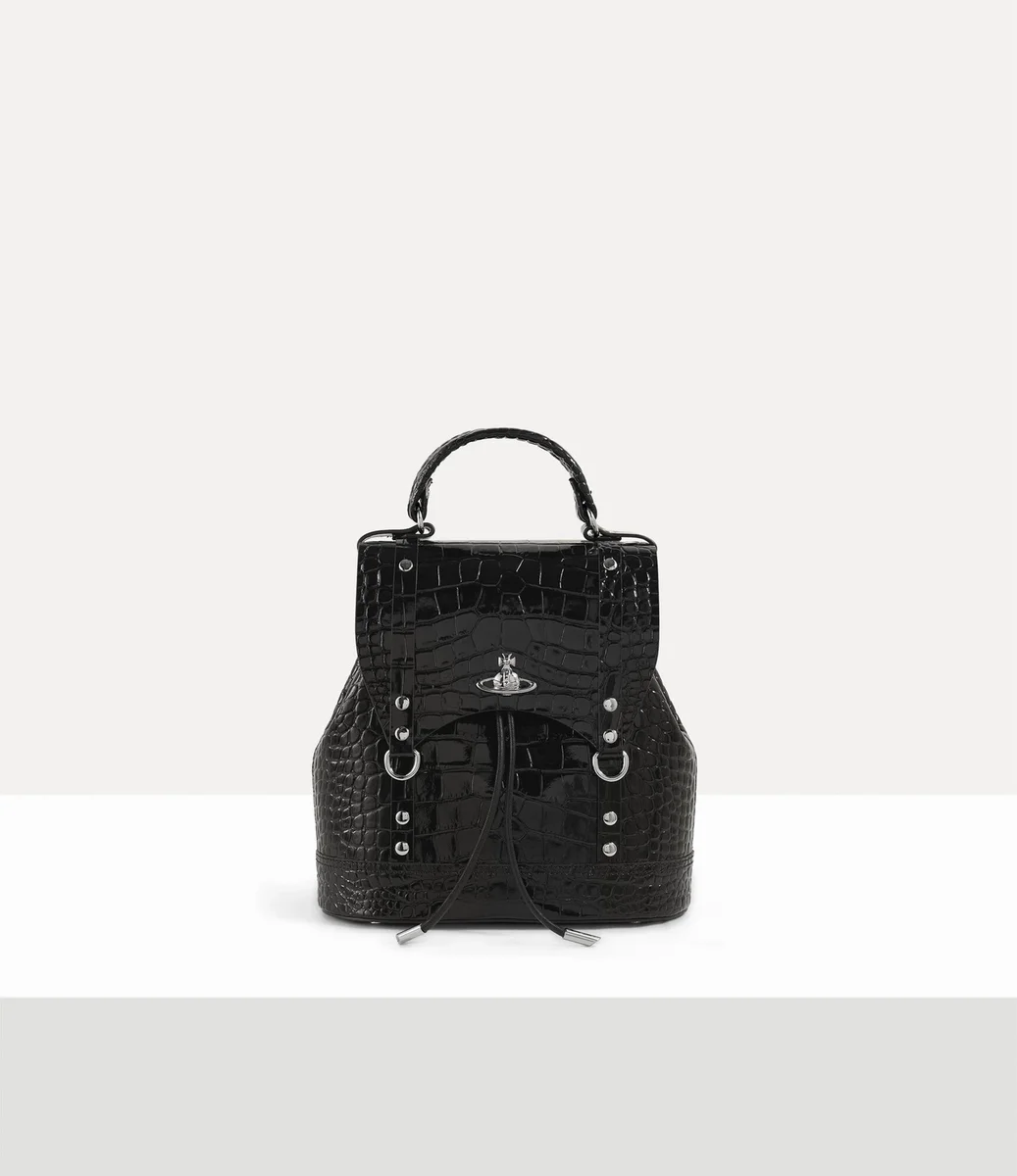 Onze kenmerkende Max Small-rugzak is verkrijgbaar in een leer met krokodillenreliëf en een laktextuur die doet denken aan de vloeibare latex en rubberen kleding die in onze iconische Sex-boetiek wordt verkocht. Het item heeft bondage-geïnspireerde elementen die doen denken aan onze ‘Erotic Zones’-collectie uit het voorjaar/de zomer van 1995.