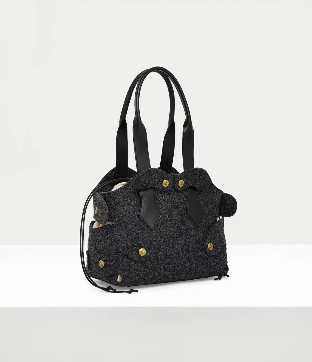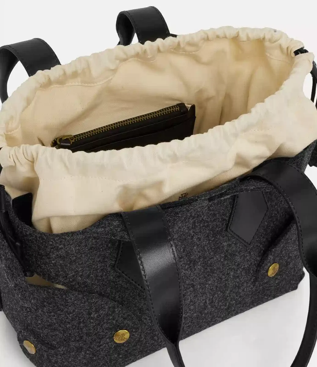 De Wilma Small-draagtas is gemaakt van dik wolvilt met behulp van een afvalvrije snijtechniek die voor het eerst werd ontwikkeld voor de herfst-wintercollectie 2007 ‘Wake Up Cavegirl’. Het ontwerp is geïnspireerd op onze archiefmodellen Flintstone-tassen en heeft een modulair drukknoopsysteem en kenmerkende speerpuntvormige handvatten die door de buitenkant zijn geregen.