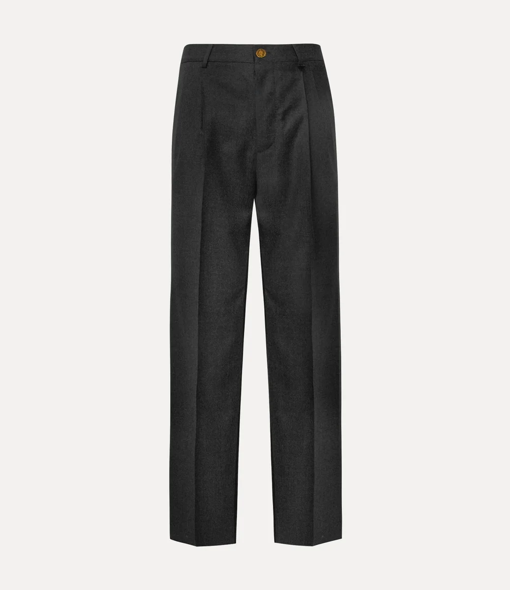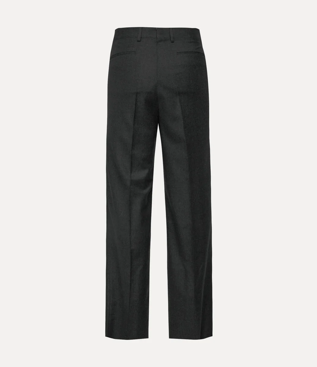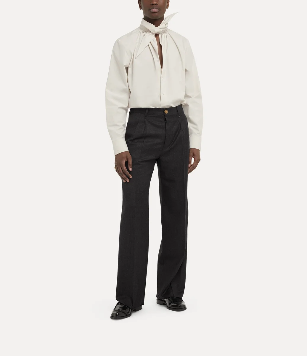 Onze Rafael-broek is gemaakt van zachte wol, subtiel geweven met een geborstelde metallic afwerking. De broek heeft een klassieke hoge tailleband met riemlussen en een vloeiende, wijde pijp met scherpe, geperste plooien.