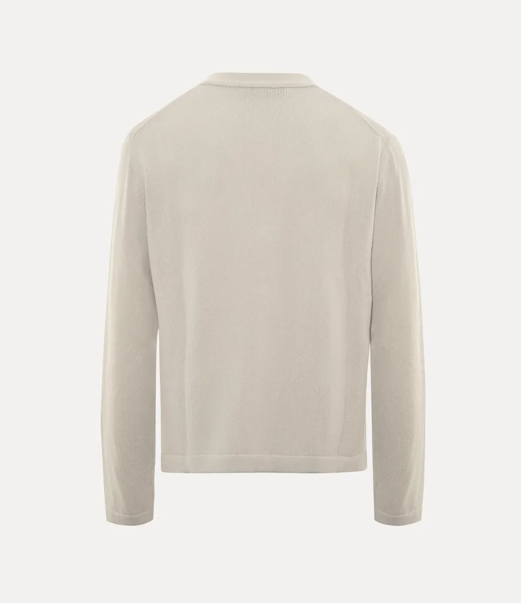 Ons archiefmodel Alex-vest is dit seizoen vernieuwd en wordt aangeboden in een zachte katoen-kasjmiermix. Het kledingstuk heeft een knoopsluiting aan de voorkant, een V-hals en een orb-detail aan de linkerkant van de borst – synoniem voor Vivienne’s visie om traditie naar de toekomst te brengen.