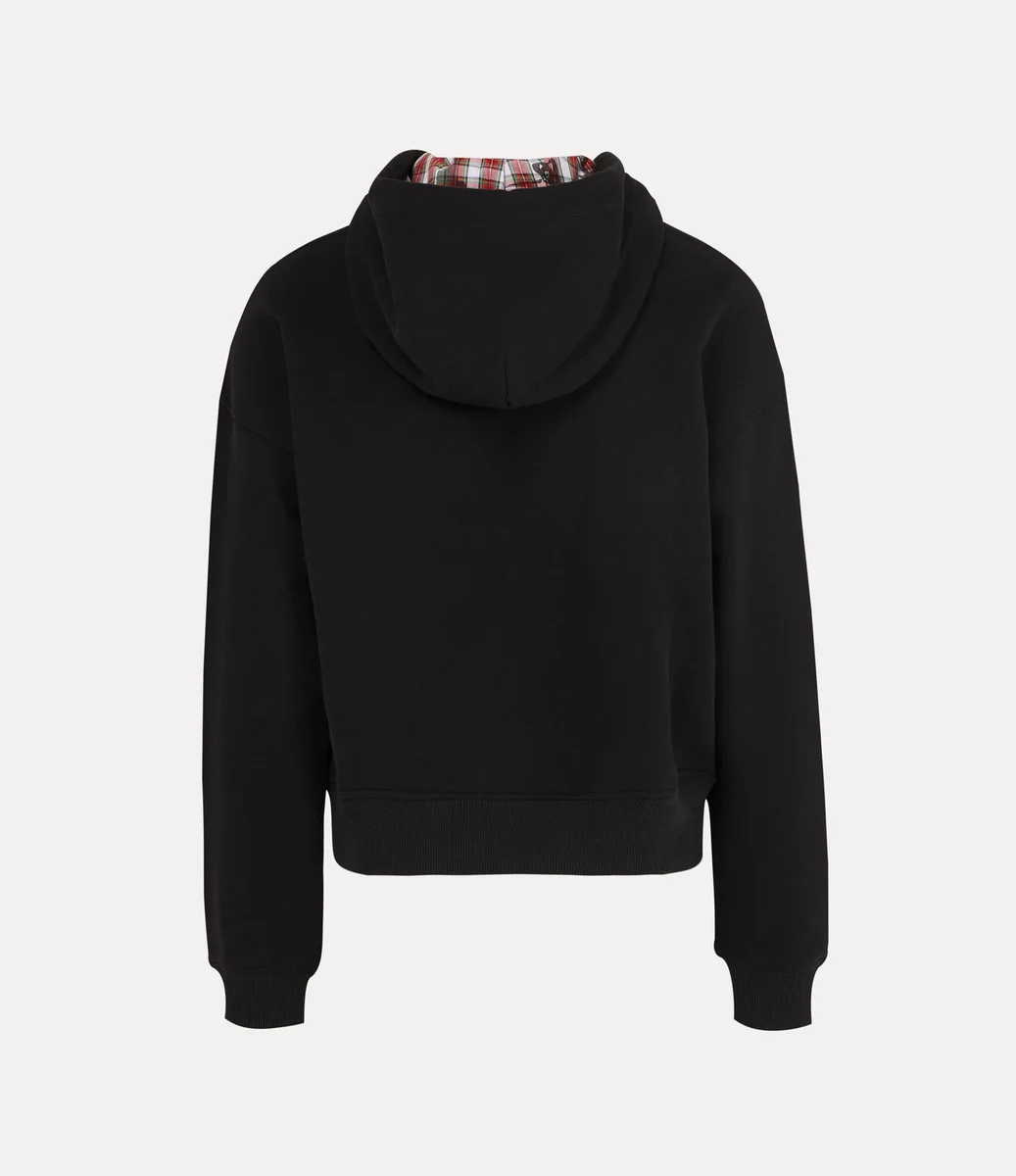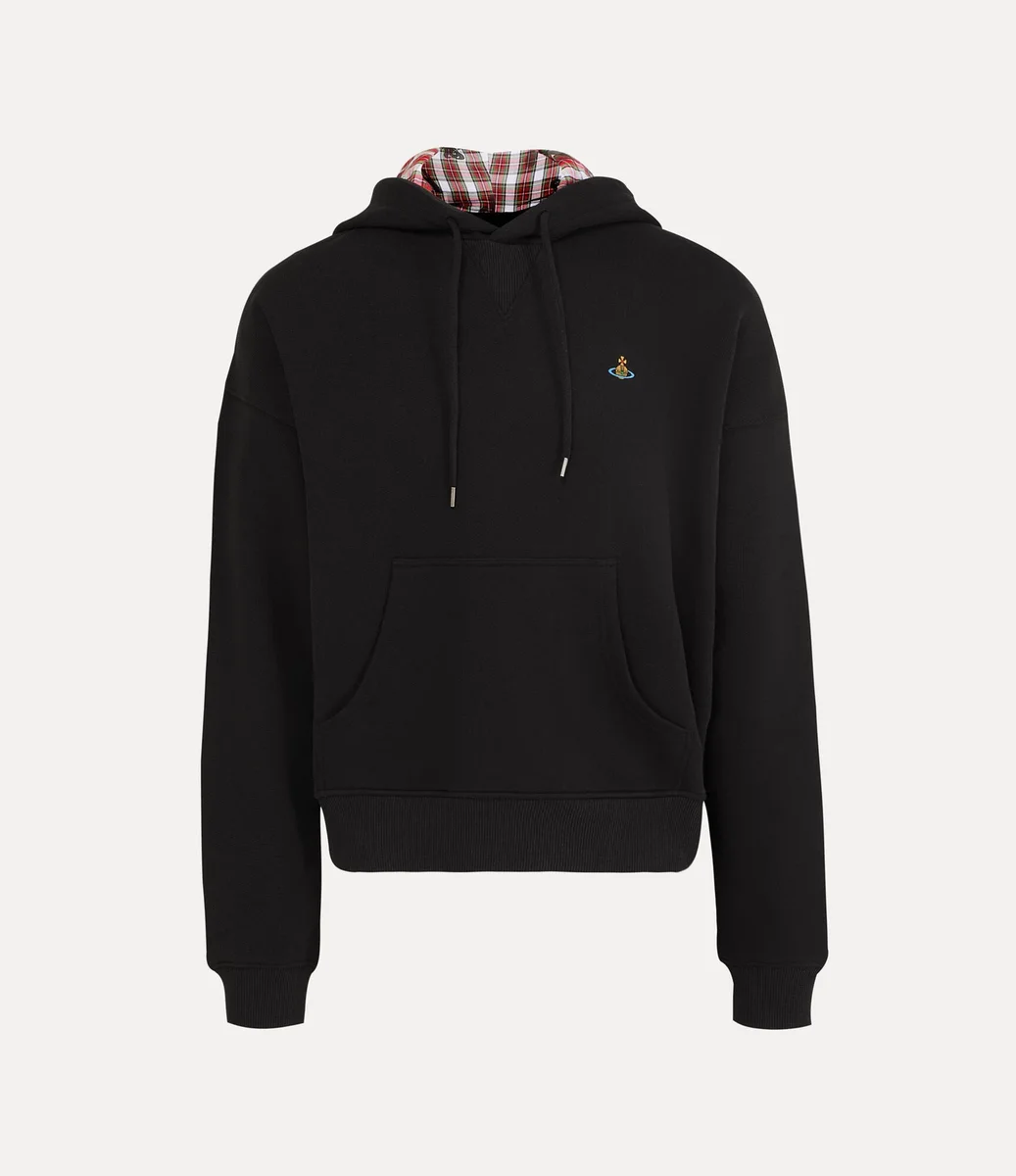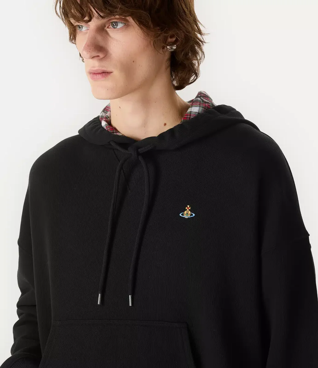 Onze Ashton-hoodie is gemaakt van zacht biologisch katoen en heeft een relaxte pasvorm, afgewerkt met een geborduurd veelkleurig orb-motief op de borst. De capuchon is gevoerd met het kenmerkende rode tartanmotief van het huis, bedekt met een kunstwerk van kunstenaar Dominic Myatt – dat een wereld vol afval weergeeft in een ironische visie op utopia.