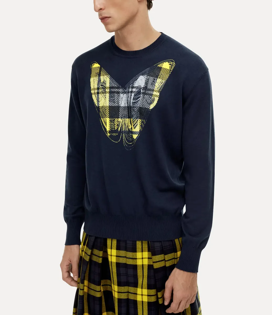 De Chaos-trui heeft een vlindermotief in het midden van het ontwerp, als eerbetoon aan de kenmerkende iconografie van het huis, bedrukt met het levendige tartan ‘Chaos’-kunstwerk van dit seizoen. Het kledingstuk heeft een klassieke ronde halslijn met lange mouwen en een rechte zoom, afgewerkt met verfijnde geribde boorden.