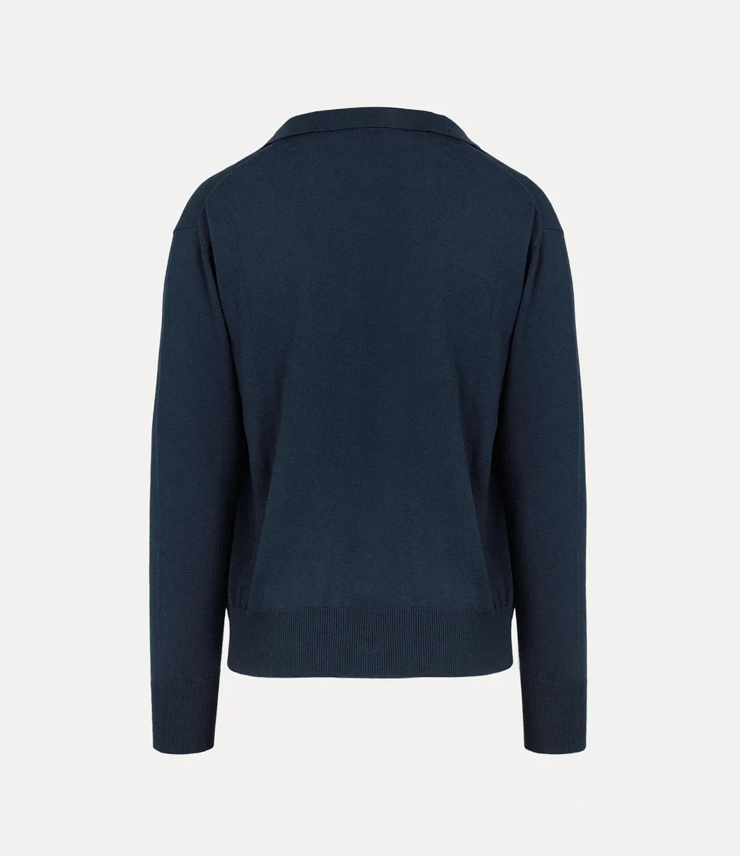 Ons Samuel-vest heeft een platte open kraag en een V-halslijn, geaccentueerd door een rij amberkleurige knopen aan de voorkant. Het kledingstuk is afgewerkt met een geborduurde bol aan de linkerkant van de borst en belichaamt Vivienne’s visie om traditie naar de toekomst te brengen.