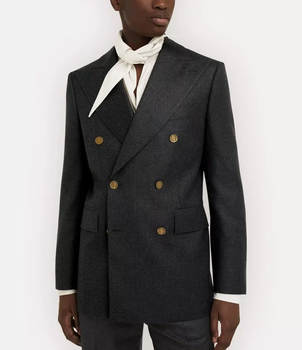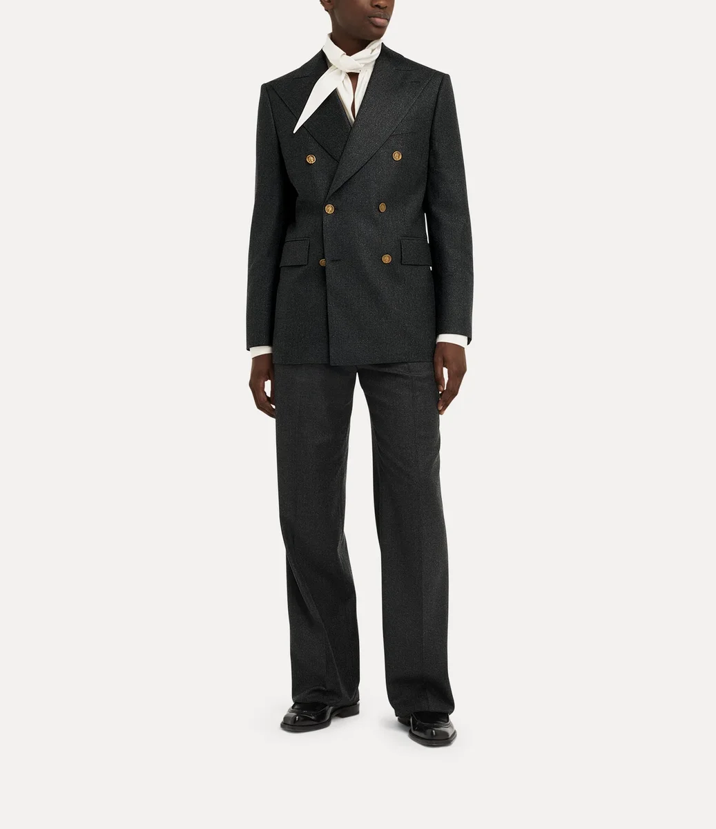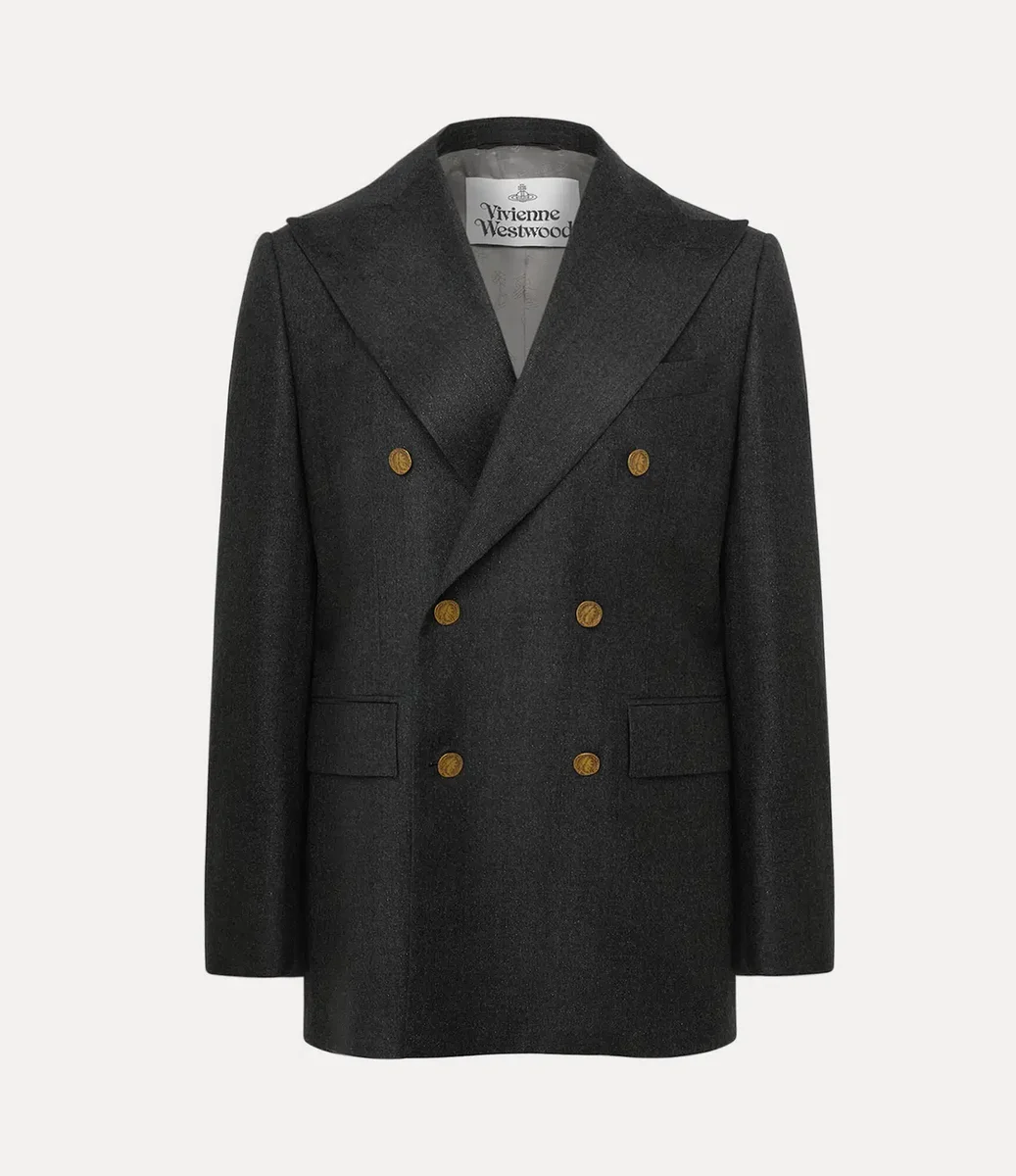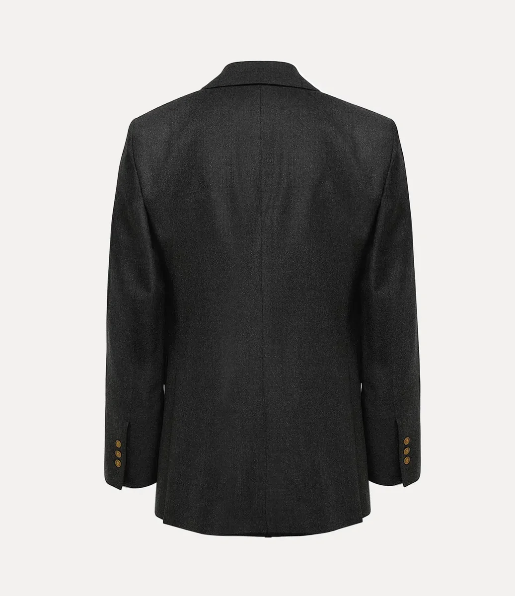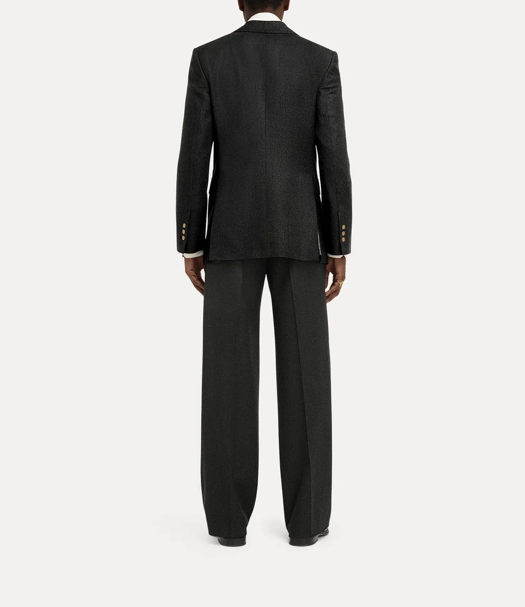 Ons Captain-jack heeft een wollen profiel en is subtiel geweven met een metallic geborstelde afwerking. Het silhouet wordt omlijst door scherpe revers en loopt uit in een strakke zoom met splitten aan de achterkant. Het jack is afgewerkt met onze ‘Tossed Orb’-binnenvoering, die synoniem staat voor Vivienne’s visie om traditie naar de toekomst te brengen.