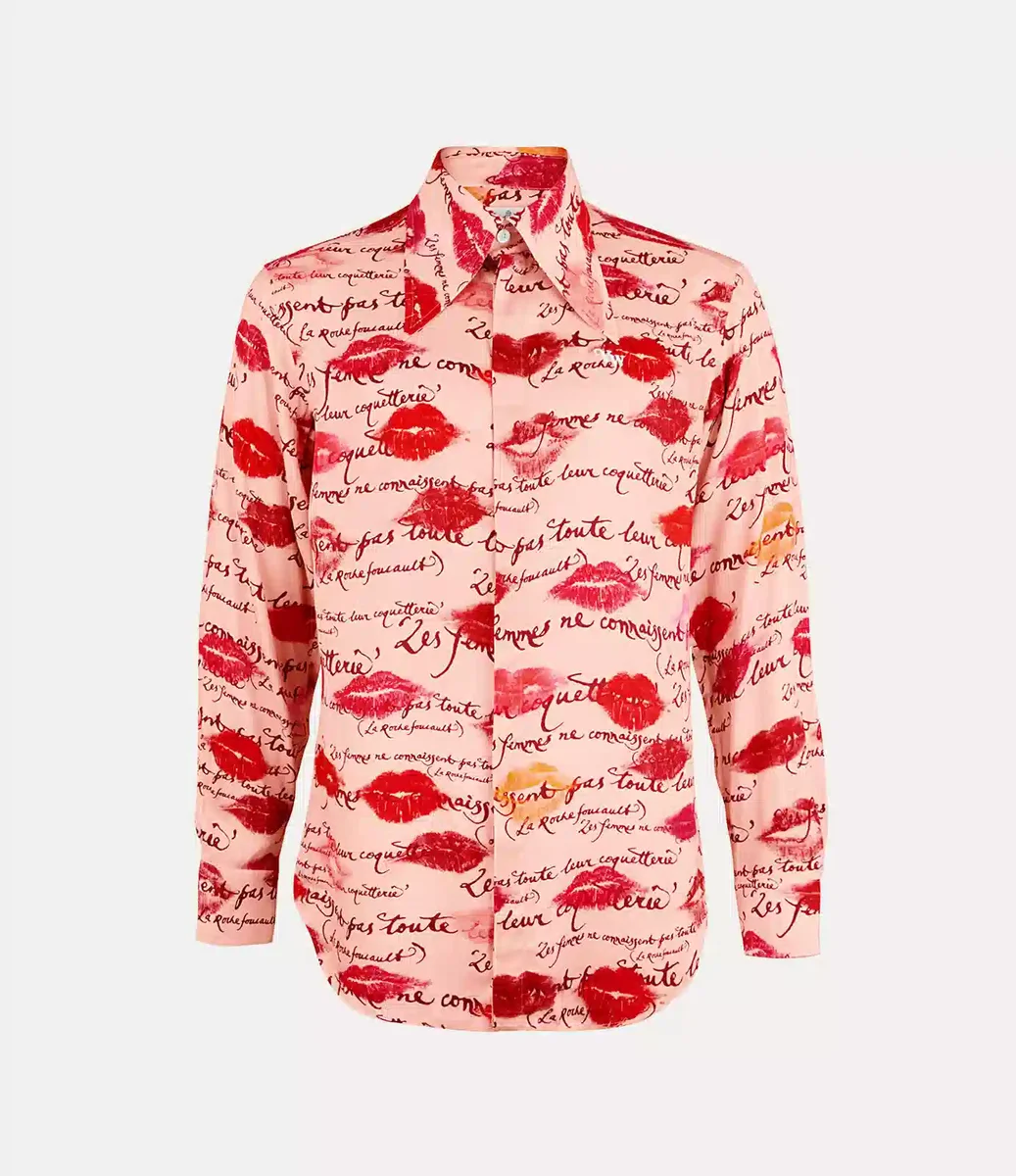 Ons smokinghemd heeft een opvallende puntkraag en een verborgen knoopsluiting. Het kledingstuk is versierd met het ‘Kisses’-kunstwerk, geïnspireerd op de verpakking van ons parfum ‘Boudoir’, met daaroverheen Viviennes handgeschreven motief ‘Les Femmes Ne Connaissent Pas Toute Leur Coquetterie’.