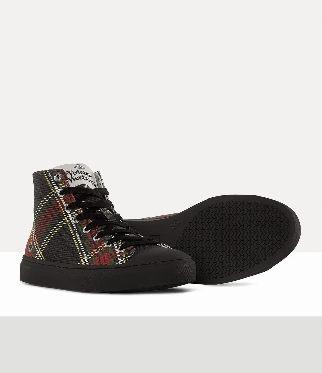 De archief High-top plimsoll is opnieuw ontworpen in het Chelsea tartanmotief van dit seizoen, geïnspireerd door traditionele Schotse Highland-regalia. Het ontwerp is geborduurd met een orb op de enkel en heeft een klassiek canvas silhouet, afgewerkt met een zachte katoenen voering.