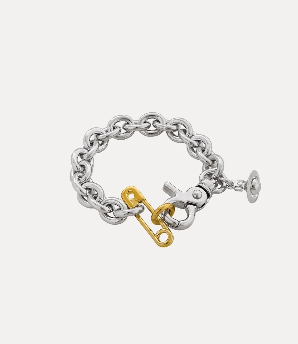 De Man. Claude armband, ontworpen met een zilverkleurige afwerking, is voorzien van ons kenmerkende veiligheidsspelddetail – een knipoog naar Vivienne’s punk-geïnspireerde, non-conformistische stijl. Een driedimensionaal metalen orb-bedeltje hangt aan de stevige kabelketting en voegt een dynamisch aspect toe aan het sieraad, terwijl de op hardware geïnspireerde sluiting zorgt voor een gemakkelijke sluiting.