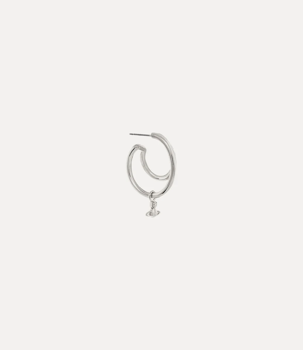 De Man. Ronda Single oorbel heeft het dubbele hoepelvormige silhouet van dit seizoen, waardoor het lijkt alsof u meerdere piercings heeft. De stijl heeft een gepolijste, zilverkleurige afwerking, versterkt door een hangend bolmotief dat elegant tussen de hoepels zit.